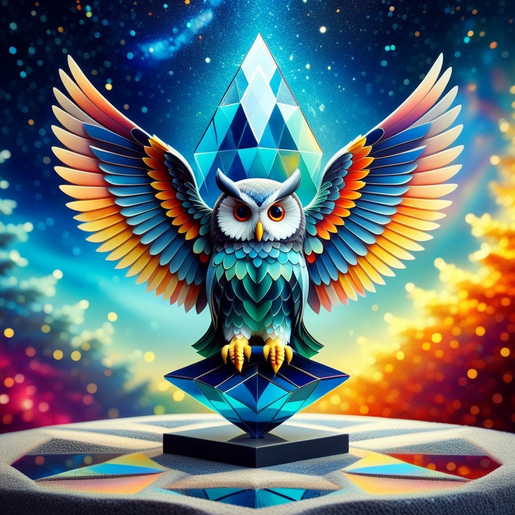 Geometric Pattern Effect: Repeating shapes (tiles, panels) create structured complexity. Color Spectrum Display: Wide range of hues from cool to warm tones. Reflective Surface Theme: Smooth, light-catching textures evoke motion and depth. Symmetry and Balance: Central alignment with mirrored visual weight. . lazypos, rp_slgd, a surreal owl composed of opal and obsidian shards, wings made of floating geometric glass, perched on a crystalline branch under a kaleidoscope sky , vibrant colors, whimsical design, surreal fantasy, high detail, 4k, strong bokeh