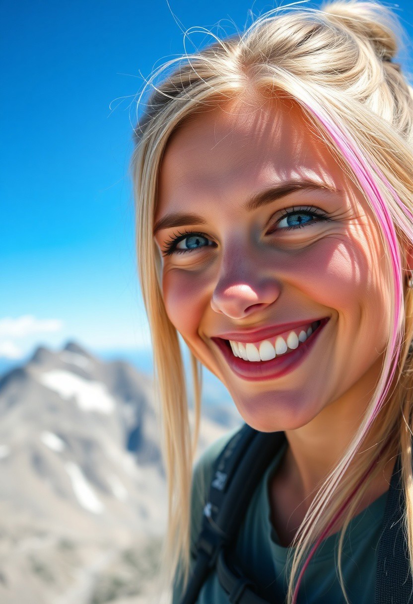 A close-up of a 26-year-old athletic woman with blue eyes and long blonde hair with pink streaks, smiling joyfully at the summit of a mountain, with a clear blue sky and rugged peaks in the background. She is wearing hiking gear.