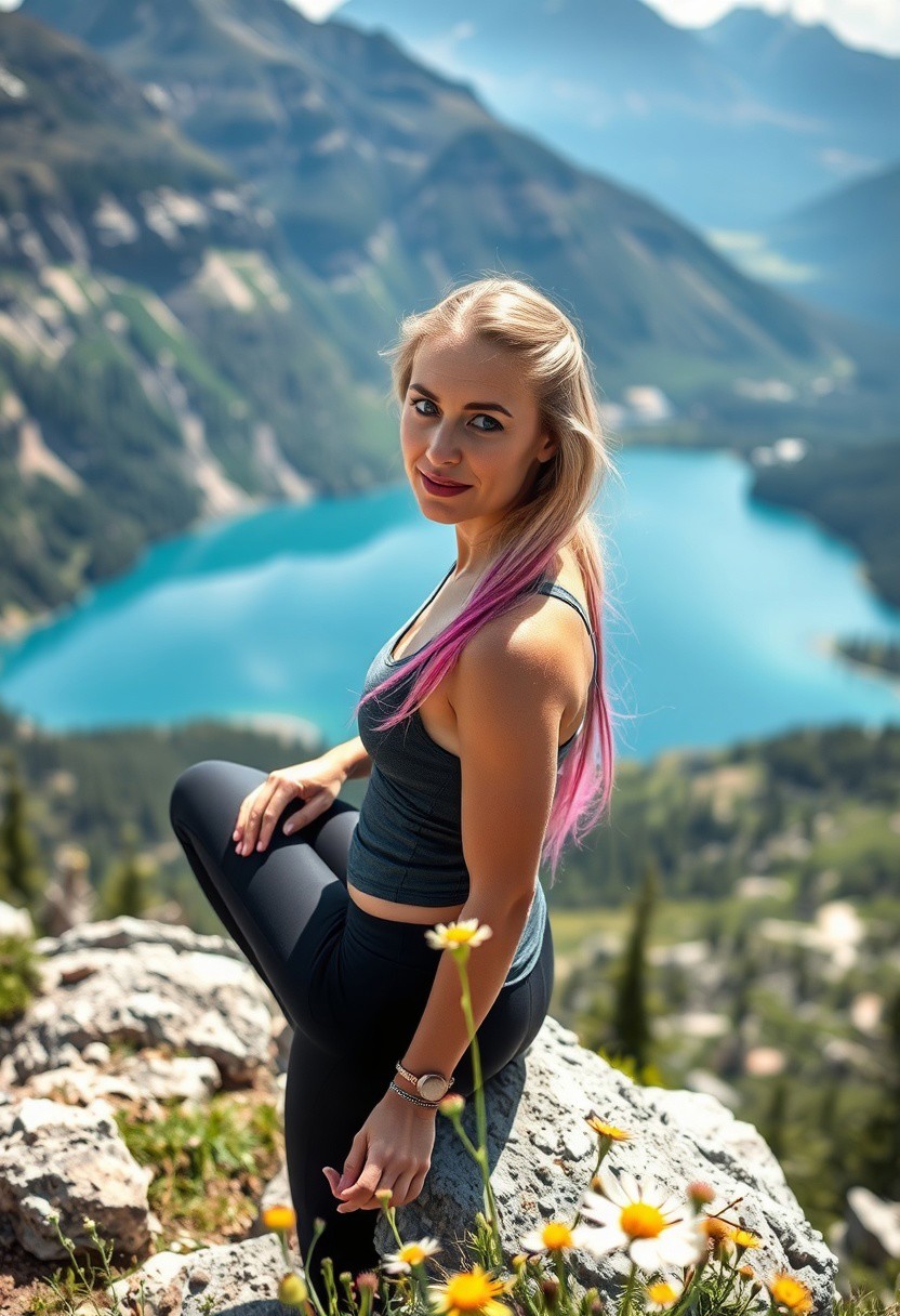 A 26-year-old athletic woman with blue eyes and long blonde hair with pink streaks, taking a break on a rocky outcrop during a mountain hike, looking out at a stunning alpine lake. The scene is peaceful and serene, with wildflowers in the foreground