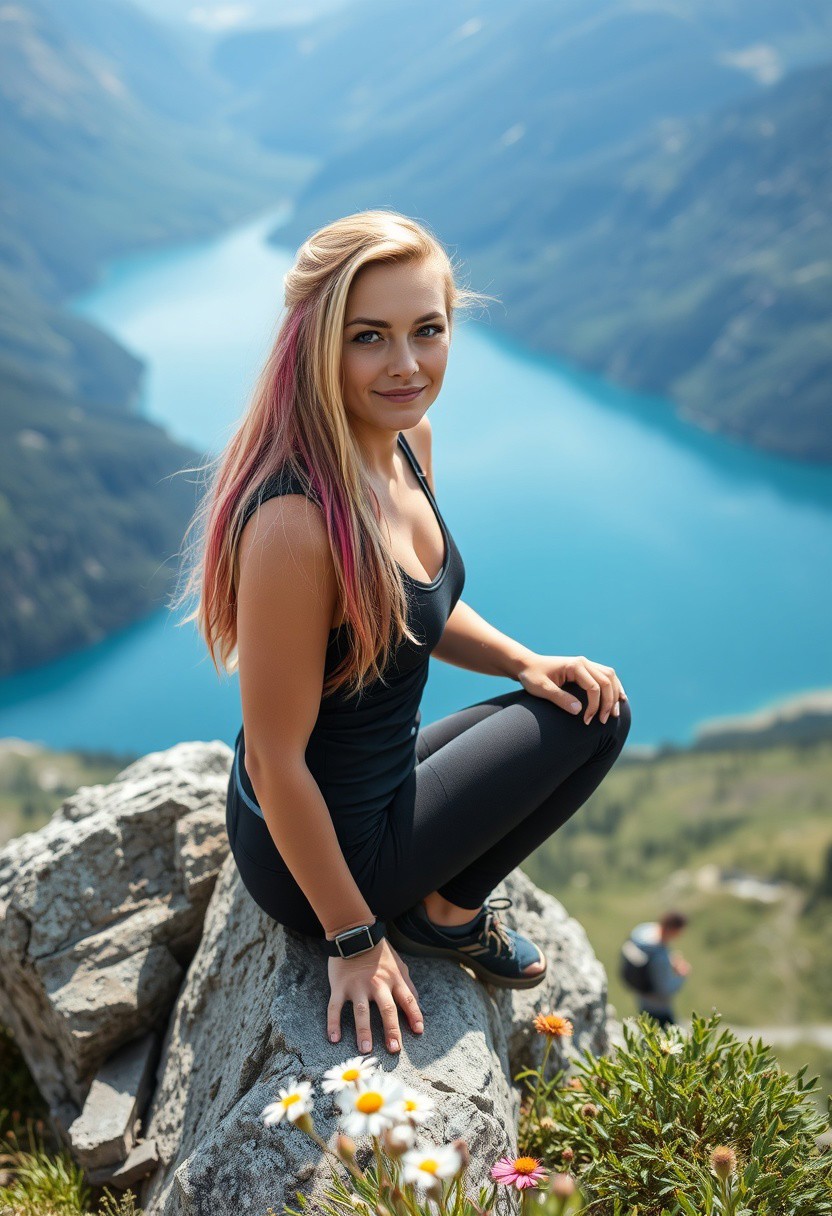 A 26-year-old athletic woman with blue eyes and long blonde hair with pink streaks, taking a break on a rocky outcrop during a mountain hike, looking out at a stunning alpine lake. The scene is peaceful and serene, with wildflowers in the foreground