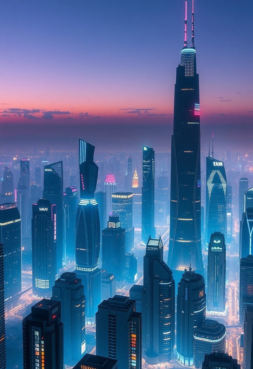 The skyline of a futuristic city, towering buildings surrounded by blue lights,
