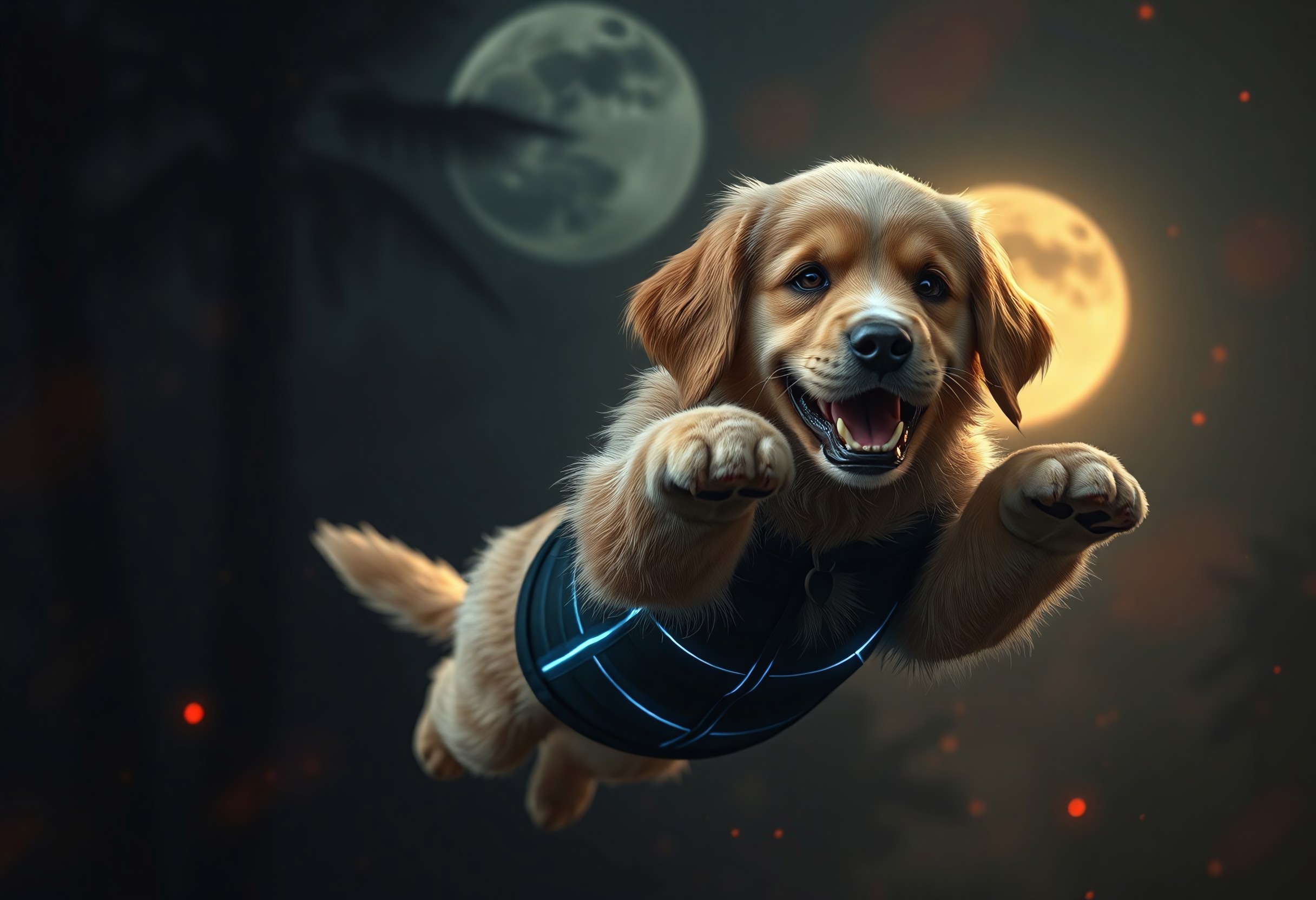 photography, 8k photo, realistic, sharp, hyperdetailed, detailed, realistic male dog, golden retriever puppy, flying, action pose, action scene, icy hair, black tight vest, glowing bight blue stripes, detached sleeves, black sleeves, looking at viewer, evil smile, perfekt eyes, eyes half closed, detailed burning eyes, dark, (dark night:1.6), dark sky, dark tropical forest, burning trees, warm backlight, neutral color grading, dark theme, giant dim moon, soft rimlight, shadow, low angle view, upper body focus, fire flies, fine red fog, lazypos, ultraST, skin_tight, covered_erect_nipples, cameltoe, impossible_clothes, red glowing clouds, miniature sculpture style shot, full body, over 9000, ssj4ultra,