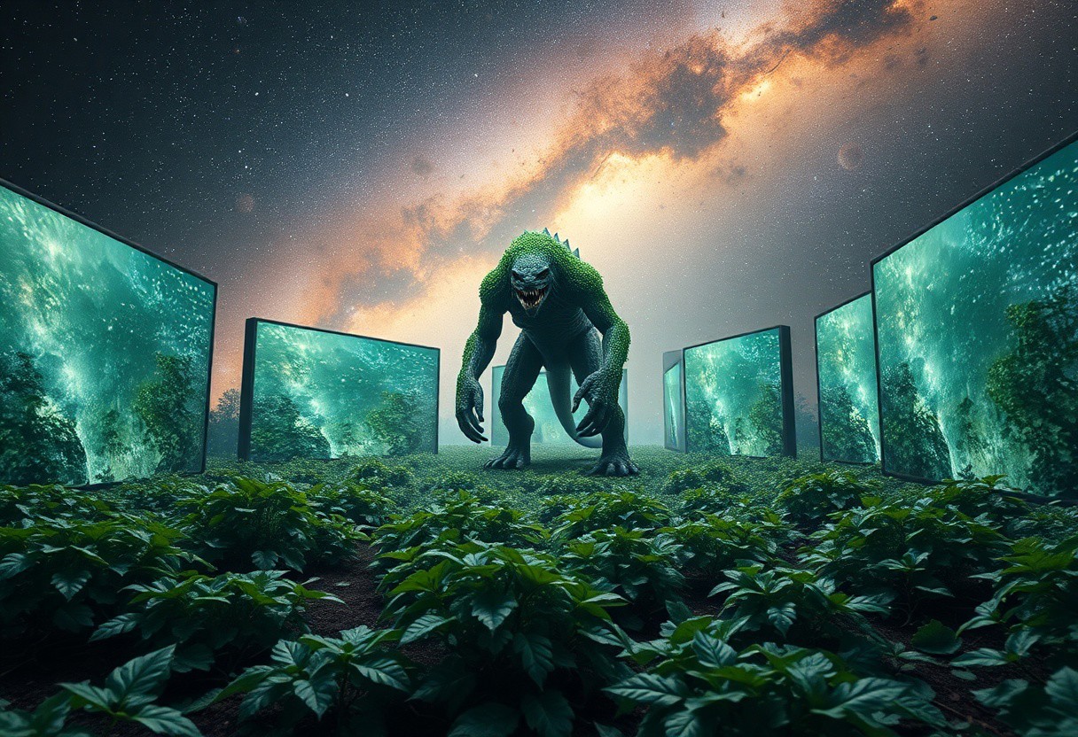 A ground surrounded, by large screens with merged ivy fillaments . cosmos background with a AI monster creature in space.