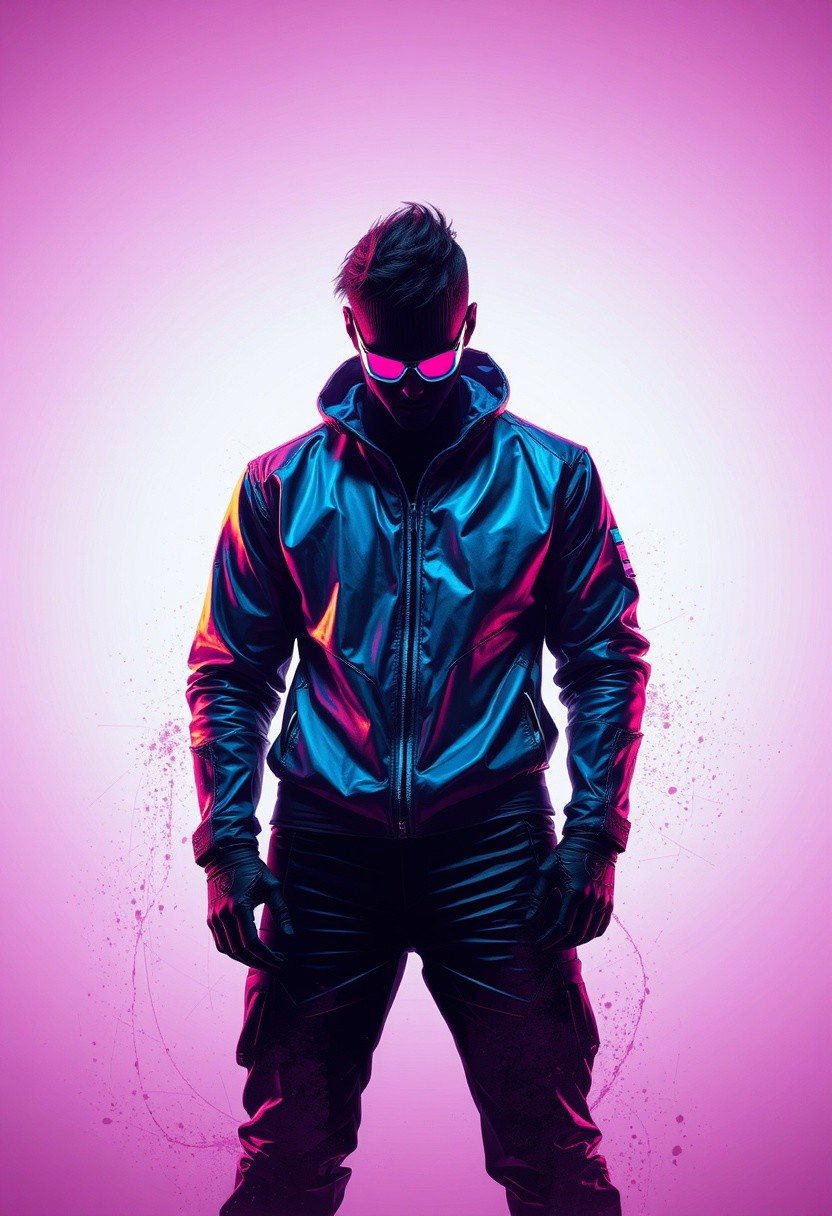 robert t techno style , Background: Clean, soft neon gradient with faint shadows and smudges, creating a stark contrast that emphasizes the character’s metallic textures and vibrant silhouette.