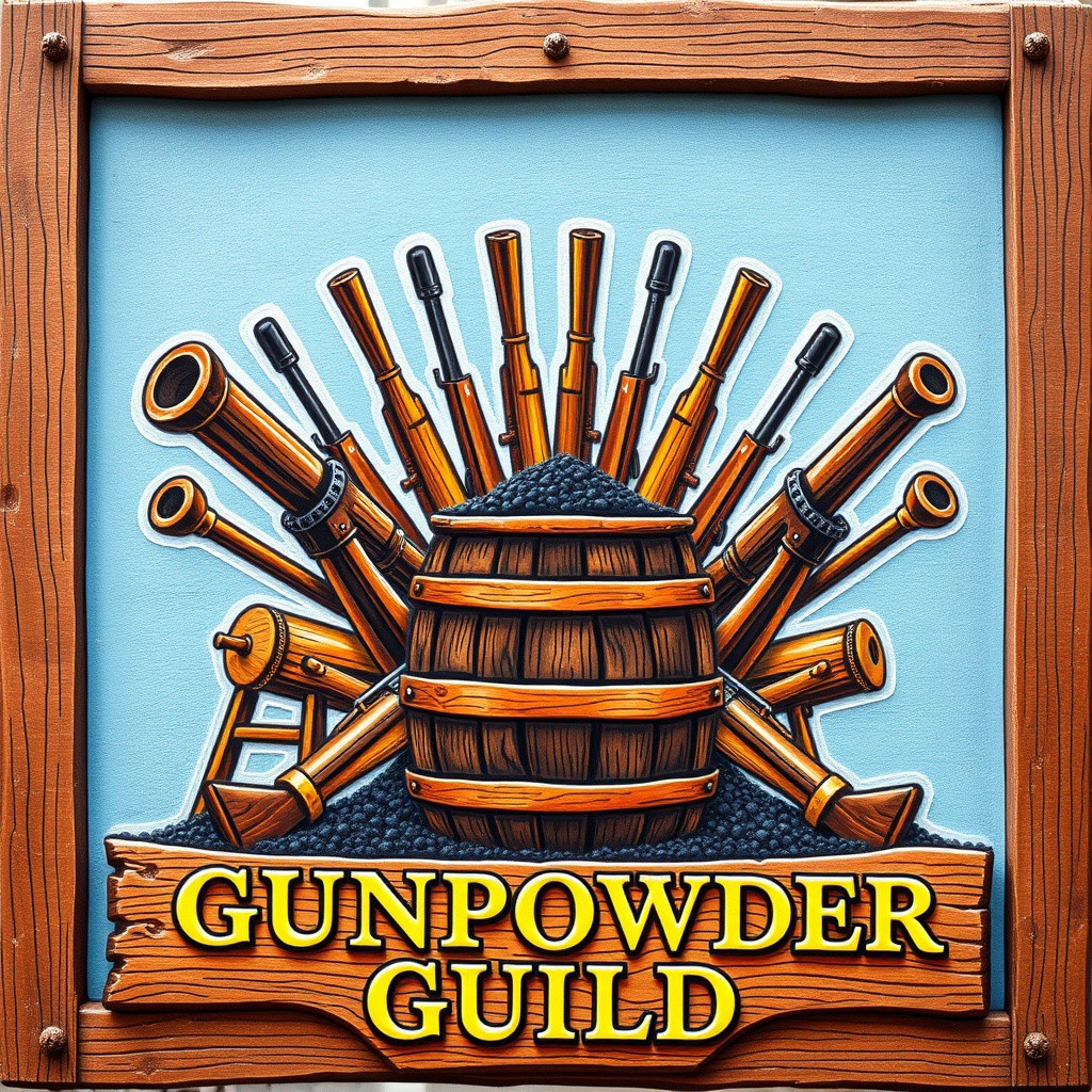 medieval colored sign, wooden sign advertising gunpowder guild, in the center is a barrel of black gunpowder, medieval cannons and muskets stick out like a fan from behind the barrel, unrealistic style, medieval painting of the 16th century, logo,