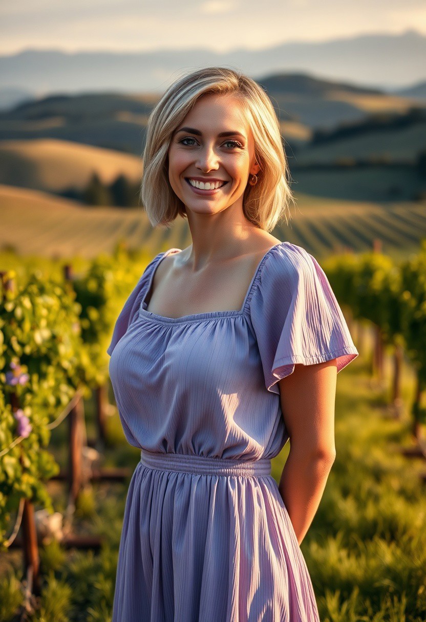A full-body portrait of a German woman, 30 years old, fair skin, short ash-blonde hair, wearing a stylish lavender short dress, smiling brightly in a lush vineyard with rolling hills in the distance, soft afternoon lighting, cinematic tones, Canon RF 85mm f/1.4 lens, hyperrealistic, MidJourney v6.