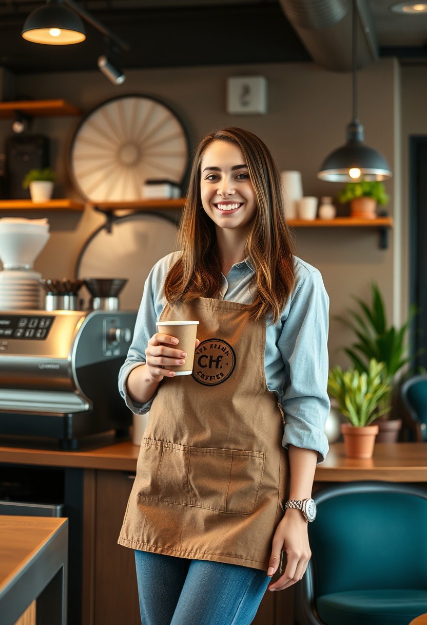 a full-body view of a cheerful young woman, age 26, standing behind the counter of a stylish coffee shop, holding a steaming cup. She’s wearing a casual shirt, jeans, and an apron with the shop’s logo. The background includes artisan coffee machines, potted plants, and cozy seating. Photographed with a 35mm lens for warm and inviting details, MidJourney v6.
