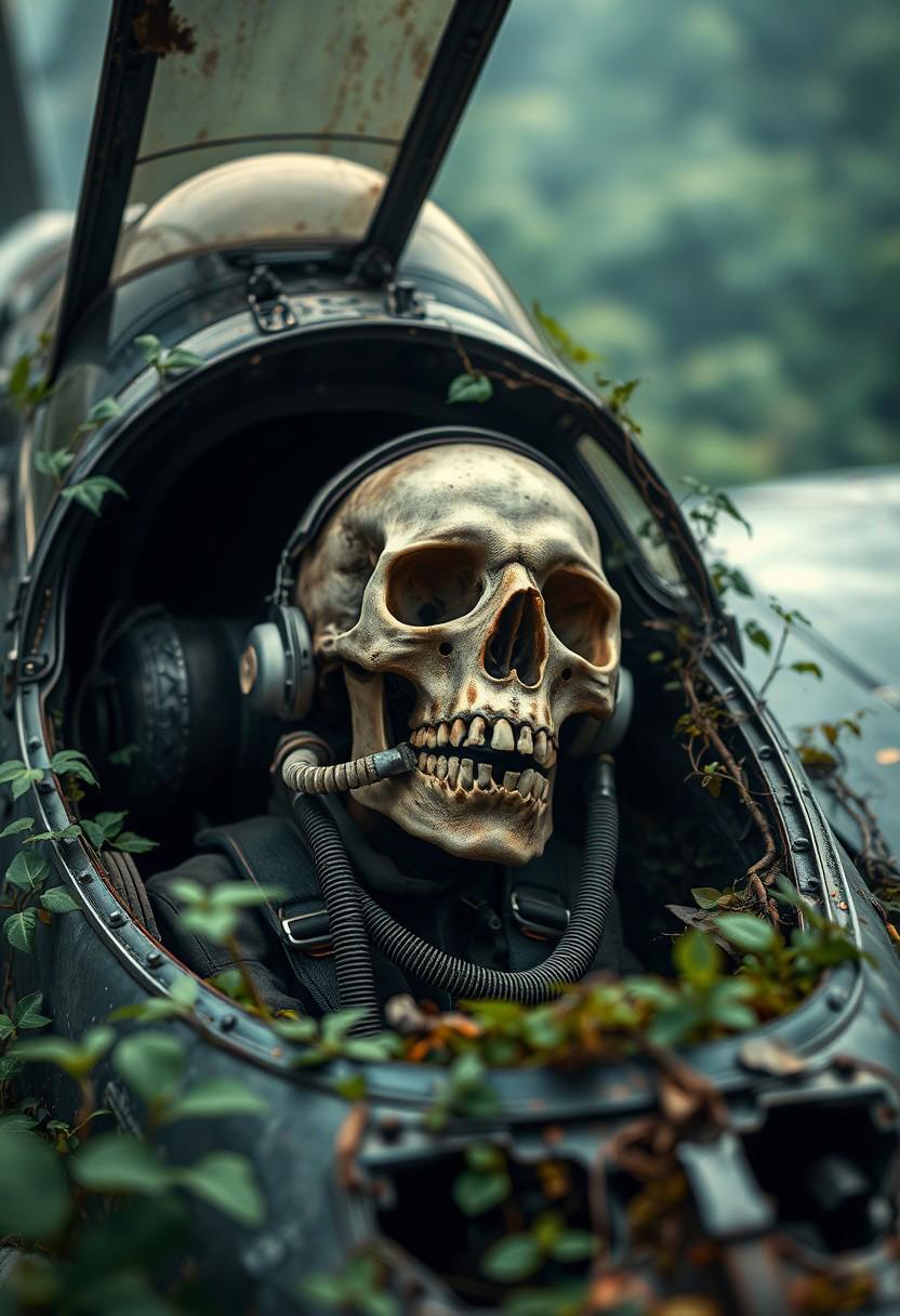 fighter jet crashed in the jungle, The centerpiece is the (decayed remains:1.4) of the deceased pilot in the large cockpit, wearing pilot helmet and oxygen mask hanging off his face, he's been deceased a very long time, vines are growing on the jet and in cockpit, a harness is seen over his skeletal remains, photo-realistic, sharp details, (best quality:1.2), uhd, masterpiece, highly-detailed, ultra-realistic, (best render:1.4), sharp detailed features, bokeh, vivid colors, the (jaw of the skull is open wide) suggesting a moment of panic and terror when the jet crashed and the skull stills reflects that terror as if skull were screaming in agony, 45 degree view,