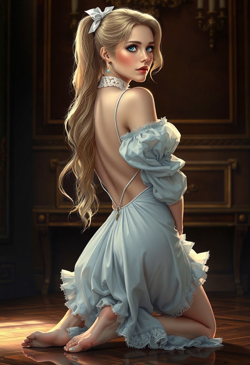 A digital illustration shoot from a profile camera angle about a sensual portrait of a woman with long, wavy blonde hair and blue eyes, dressed in a revealing, light-colored dress with puffy sleeves and a white choker, showcasing her back and lower body. the image also shows a soft, warm lighting that highlights her curves and the intricate details of her outfit. on the middle of the image, a 20 years old woman, who appears to be in her early twenties, with light skin, is kneeling on the floor with her back to the viewer, looking over her shoulder with a seductive expression. she has a slender physique and is wearing a light blue and white dress with frilly details, including a white ribbon in her hair and a pair of earrings. her hair is styled in a long, flowing ponytail, and she has blue eyes that are looking to the side. the background is a dark, ornate room with a dark brown wall and gold accents, creating a luxurious and elegant atmosphere. the overall style is realistic with a touch of fantasy, and the lighting is soft and warm, casting gentle shadows that accentuate her curves.