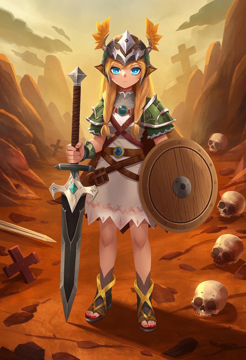 ChildBook, A female warrior standing confidently in a battle-scarred wasteland. She has long blonde hair in braids, blue eyes, and a serious expression. She wears a winged metal helmet, shoulder armor with green and metallic tones, and a short white skirt with a jagged hem. She holds a large sword in one hand and a round wooden shield with metal edges in the other. Her footwear consists of gold gladiator sandals with straps. The background features a desolate, rocky battlefield with scattered swords, crosses, and a skull. The lighting is warm and dramatic, and the art style has a fantasy RPG aesthetic.