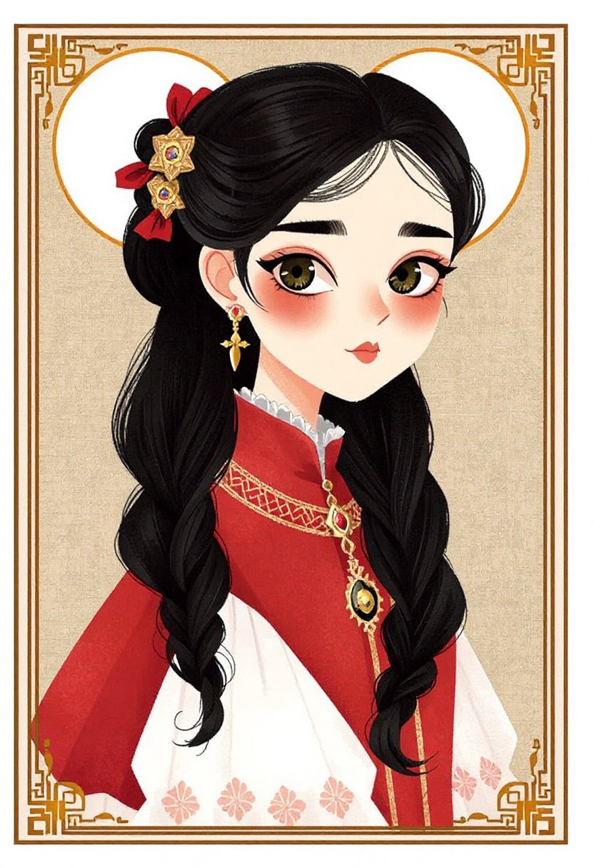 ChildBook, Woman in Red and White An illustrated portrait of a woman with striking eyes and black hair, wearing a red and white historical dress, adorned with elegant jewelry