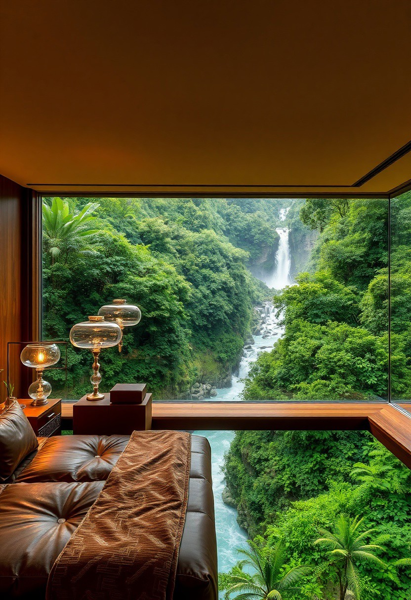 An ultra modern bedroom scene situated over the top edge of a waterfall, edge of the river just before the water cascades down to the valley below, lush green tropical forest, bedroom is furnished in lush brown leather tones, rich wood, clean modern glass lamps with warm inviting lighting, large windows let in natural light and provide a stunning view