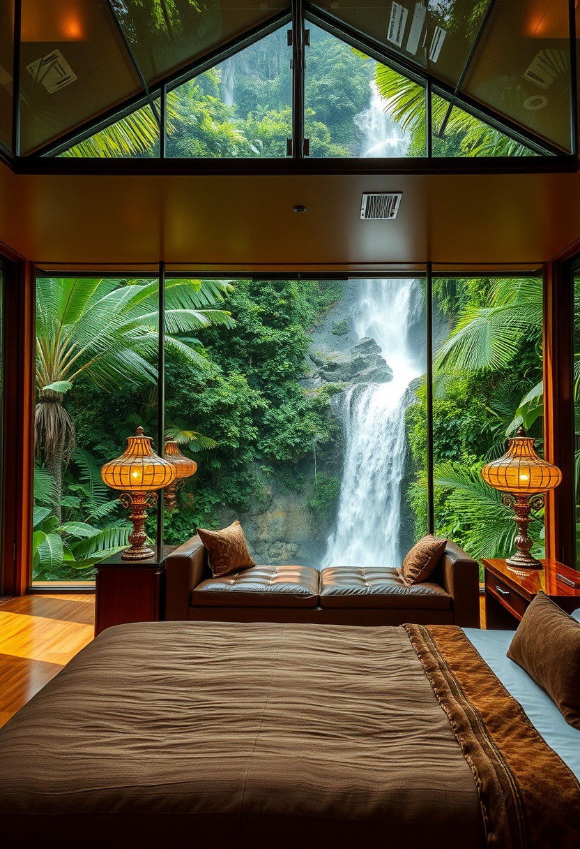 A stunning ultra modern bedroom scene situated on the edge of a waterfall in a lush green tropical forest, bedroom is furnished in lush brown leather tones, rich wood, ornate glass lamps with warm inviting lighting, large windows let in natural light and provide a stunning view of the waterfall outside