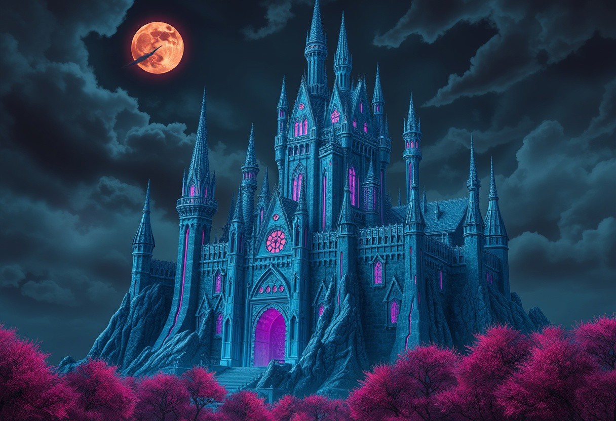 castle, living crystal castle, blue flesh with pink veins, detailed , hr giger, lovecraft, pink trees, blood moon, dark clouds,
