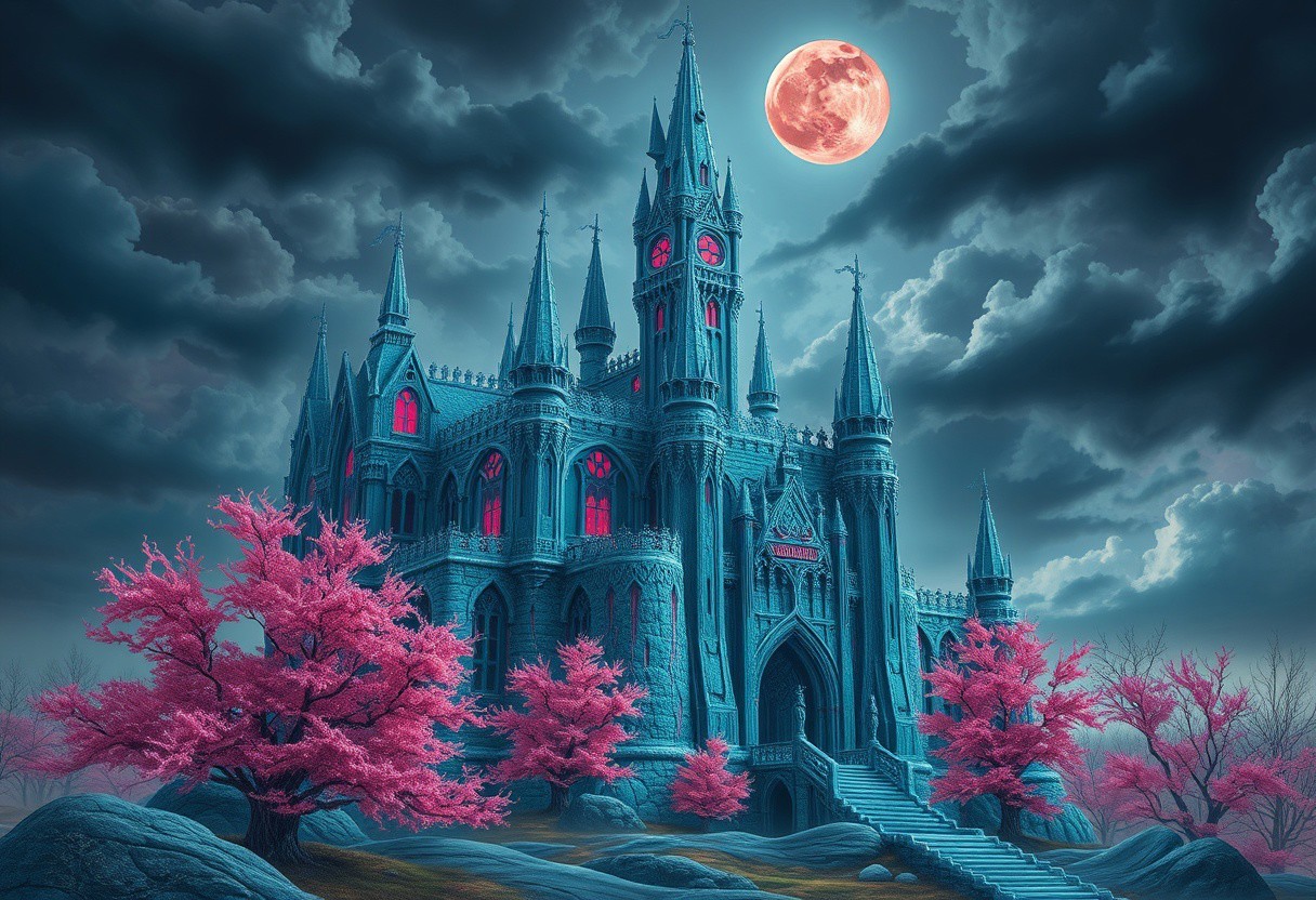 castle, living crystal castle, blue flesh with pink veins, detailed , hr giger, lovecraft, pink trees, blood moon, dark clouds,
