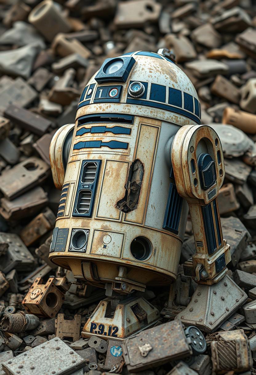 r2d2 rusted, broken, dented, discarded in scrap heap, photo-realistic, sharp details, (best quality:1.2), uhd, masterpiece, highly-detailed, ultra-realistic, (best render:1.4), sharp detailed features,