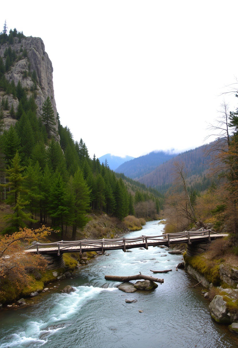 The image depicts a serene, natural landscape dominated by a dramatic rock formation on the left, its rugged face partially covered by a sparse growth of pine trees. The trees extend down the slope, gradually becoming denser and exhibiting a mix of green and subtle autumnal hues as they recede into the valley. A rustic wooden bridge spans a clear, fast-flowing river that winds its way through the foreground, its surface reflecting the overcast sky. The bridge appears well-worn, with stone supports grounding it to the riverbanks. Beyond the river, the valley stretches into the distance, with layers of tree-covered mountains fading into a misty horizon under a soft, diffused light from the cloud-laden sky. The overall atmosphere is tranquil and remote, suggesting an untouched wilderness.