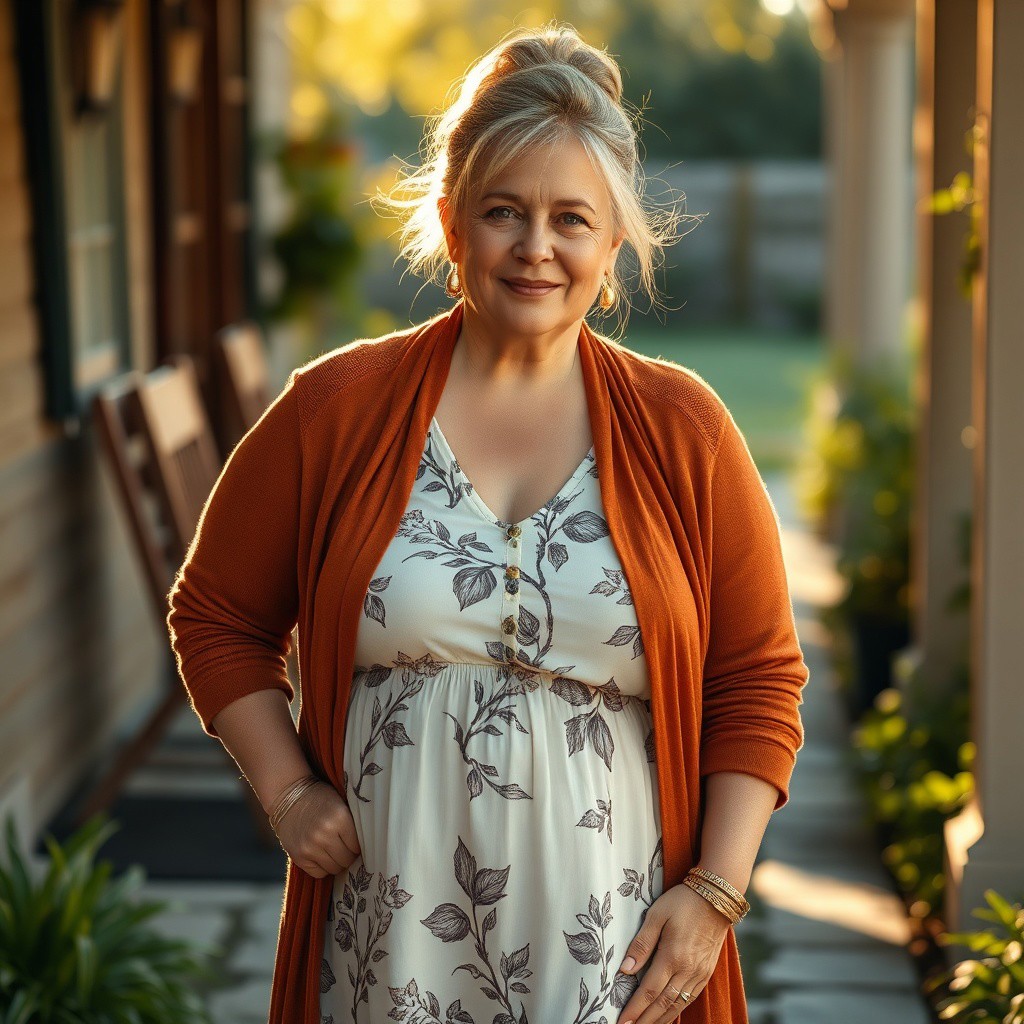 masterpiece portrait of a relaxed mature woman::1.4, Norman Rockwell style::1.2, realistic impressionist art::1.1, (physical description: full body shot, PLUMP build with soft curves PROTRUDING BELLY, fair skin with a gentle glow, casual posture:1.1) (facial features, expression: serene and content expression, gentle lines around the eyes, MESSY BUN WITHwispy strands of hair framing the face:1.0) (clothing details: breezy knee-length dress with light-colored base and darker botanical or floral pattern, paired with a rust-colored open-front cardigan:1.0) (accessories:((BAREFOOT, THICK BRASS STRAP ANKLETS:09))(, simple stud earrings or no jewelry, understated natural styling:0.9) (background setting: sunlit cottage garden path or cozy front porch with greenery and warm textures:0.9) (lighting style: soft golden hour light, diffused natural sunlight with warm highlights:0.8) (composition and camera framing: full body centered shot, eye-level angle, gently candid moment mid-step or adjusting cardigan:1.0) (emotional tone or theme: relaxed domestic elegance, warm weather comfort, tranquil and familiar atmosphere:0.9) (technical execution: soft painterly textures, focus on fabric movement and natural lighting interplay, lifelike color rendering:0.8) HER ANKLE IS CHAINED TO THE PORCH, 3D isometric render