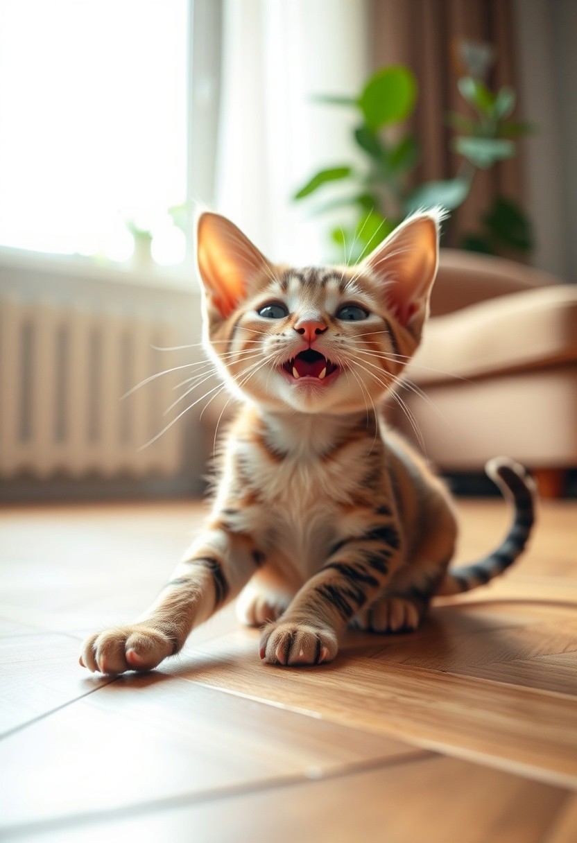 A playful “cat-olotl” (chesire cat with tiny pink axolotl gills where its whisker pads meet) sits on a sun-lit parquet floor in a cozy living room. • The kitten faces camera, mouth open in a happy “mraow,” eyes bright and blinking. • Its frilly gills wiggle gently in time with each meow. • Tail swishes side-to-side and thumps floor once, then curls around its body. • Ears flick forward and back, whiskers twitch. • Soft daylight drifts through a nearby window; light shifts just enough to reveal fur texture. Motion remains subtle, cute, and loop-friendly (about 4–5 seconds). Camera locked off—medium-close framing from paws to ear-tips, sofa and plant blurred softly in the background. Close