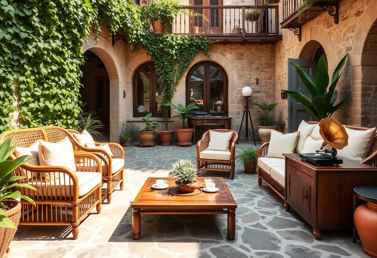 Mediterranean Courtyard Jazz Lounge – Sunlit Vintage Harmony Bathed in soft daylight and surrounded by rustic stone architecture, this enchanting Mediterranean courtyard transforms into a serene outdoor jazz sanctuary. Ivy cascades gently from the upper balcony, framing arched doorways that lead to cozy rooms beyond, while terracotta pots brim with lush greenery and vibrant tropical leaves. At the heart of this idyllic space is a thoughtfully arranged sitting area, where classic rattan armchairs and sofas with plush cream cushions invite quiet moments under the sun. The furniture is handcrafted with curved bamboo frames and cane weave details — a timeless nod to Mediterranean artisan style. In front of the seating, a solid walnut low coffee table sits atop the stone floor, adorned with a set of porcelain cups, a small fern, and vintage jazz vinyl sleeves scattered like memories of past afternoons. To one side, adding soul and sound to the ambiance, stands an exquisite vintage audio setup: A polished mahogany stereo cabinet, home to a brass-horn gramophone, tube amplifier, and a classic turntable spinning smooth jazz records. A pair of floor-standing wooden speakers with dark fabric grills flank the system, spreading warm analog tones across the courtyard. Next to the sound system, a tall ceramic jug overflows with blooming sunflowers, their golden faces turned toward the light like a tribute to joy. A second bouquet, arranged in a glass vase on a nearby bench, adds