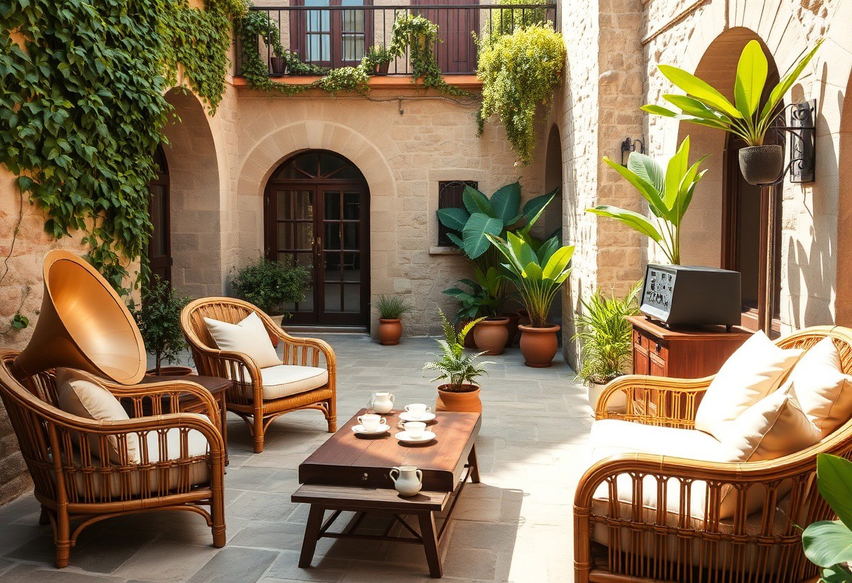 Mediterranean Courtyard Jazz Lounge – Sunlit Vintage Harmony Bathed in soft daylight and surrounded by rustic stone architecture, this enchanting Mediterranean courtyard transforms into a serene outdoor jazz sanctuary. Ivy cascades gently from the upper balcony, framing arched doorways that lead to cozy rooms beyond, while terracotta pots brim with lush greenery and vibrant tropical leaves. At the heart of this idyllic space is a thoughtfully arranged sitting area, where classic rattan armchairs and sofas with plush cream cushions invite quiet moments under the sun. The furniture is handcrafted with curved bamboo frames and cane weave details — a timeless nod to Mediterranean artisan style. In front of the seating, a solid walnut low coffee table sits atop the stone floor, adorned with a set of porcelain cups, a small fern, and vintage jazz vinyl sleeves scattered like memories of past afternoons. To one side, adding soul and sound to the ambiance, stands an exquisite vintage audio setup: A polished mahogany stereo cabinet, home to a brass-horn gramophone, tube amplifier, and a classic turntable spinning smooth jazz records. A pair of floor-standing wooden speakers with dark fabric grills flank the system, spreading warm analog tones across the courtyard. Next to the sound system, a tall ceramic jug overflows with blooming sunflowers, their golden faces turned toward the light like a tribute to joy. A second bouquet, arranged in a glass vase on a nearby bench, adds