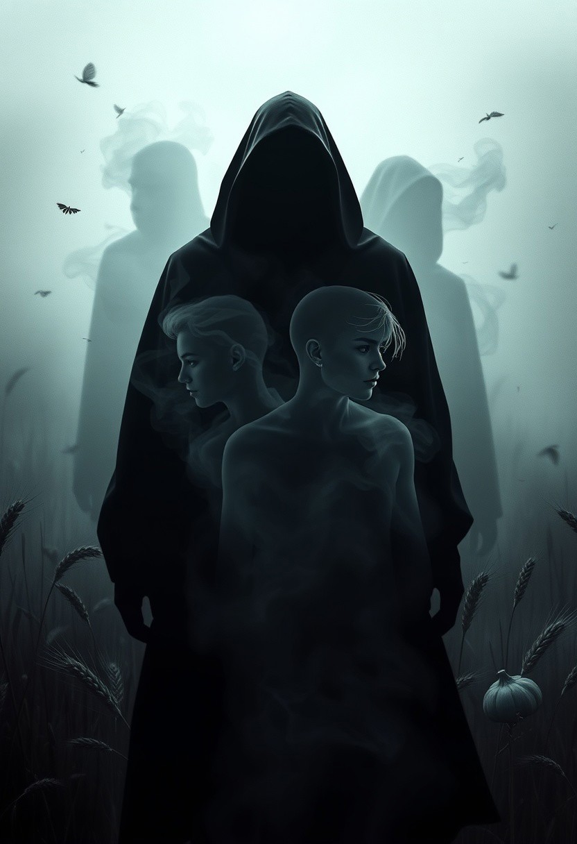 A haunting and surreal double exposure composition merges unsettling beauty with conceptual depth. In the center, a faceless humanoid silhouette looms — rendered in stark 3D shadow, its contours smooth and geometrically elegant. Within its form, swirling wisps of fog and motion blur suggest movement and presence, like a ghost caught mid-stride. Behind and within the figure, a series of minimal, vector-like facial features and body outlines — reminiscent of Julian Opie's clean-line aesthetic — pulse with subtle digital glow. This contrast of simplified modern portraiture against eerie, immersive textures forms a complex, layered interplay of light and shadow. The atmospheric background, slightly rustic with scattered wheat stalks, garlic bulbs, fluttering leaves, and an undertone of red heart symbolism, evokes a folkloric warning, blending earthy fears with digital innovation. It feels both ancient and ultramodern — a poetic nightmare sculpted in pixels.