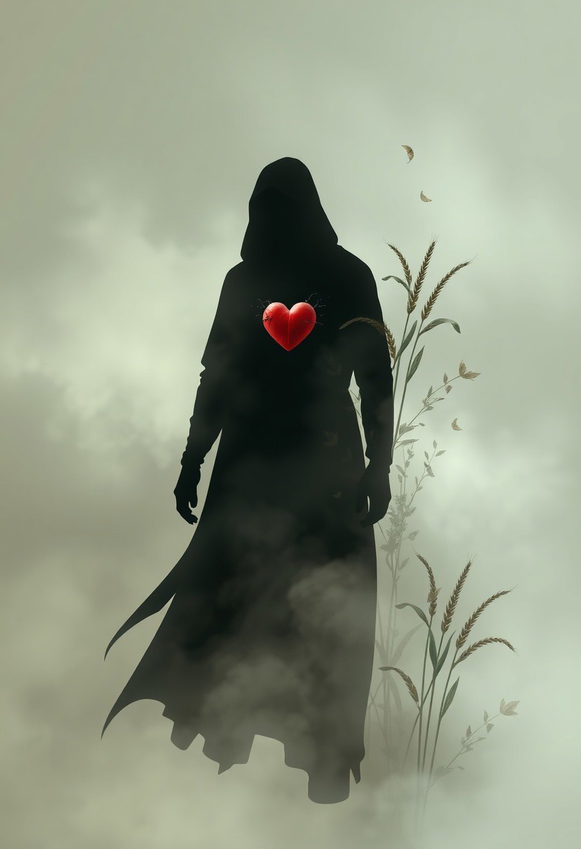 double exposure, ghostly silhouette, 3D shadow figure, surreal atmosphere, Robby Cavanaugh style, Julian Opie minimalist portraiture, digital art, clean vector lines, fog and motion blur, abstract fear, modern digital innovation, earthy elements, garlic, wheat, leaves, floating heart, haunting presence, dynamic composition, sleek design, eerie concept art, contemporary surrealism, layered shadows, stylized fear, conceptual fusion