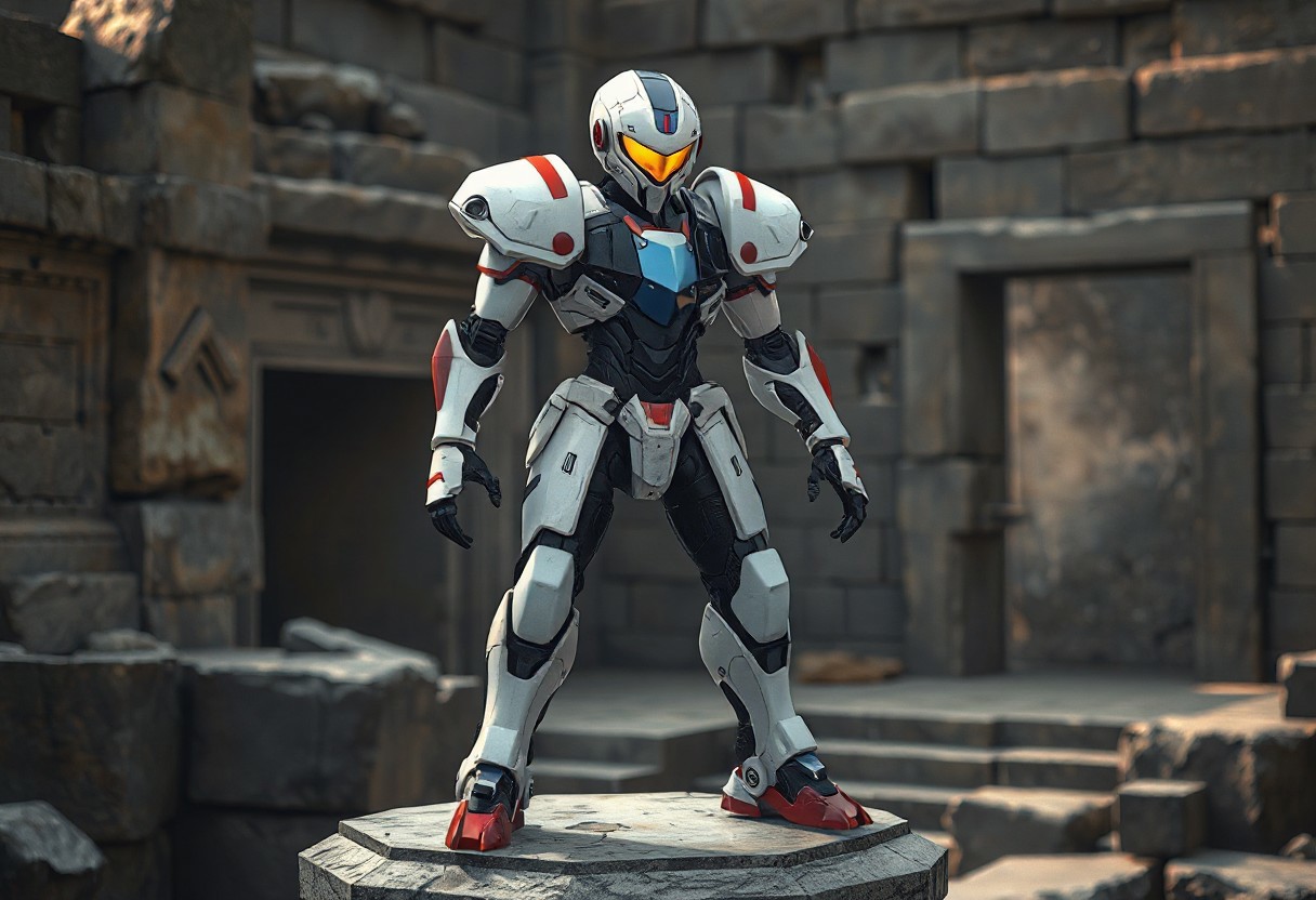 A Cyber Soldier of Darkworld robot, stark white armor with crimson & sapphire accents, black limbs, vibrant yellow head, ruby visor, geometric blue/white chest, scarlet feet. Heroic stance, arms posed for action, balanced posture on an ancient stone plinth. Amidst the mystic ruins of TheSecret Village of the Spellcasters. Poised stillness charged with latent energy. Cinematic lighting, Octane Render, Unreal Engine 5, Photorealistic, trending on ArtstationHQ, CGSociety, 4K, HDR, Sharp focus, Dynamic Angle, Golden Ratio, Matte Painting, Splash Ink style. Detailed, high quality, intricate.