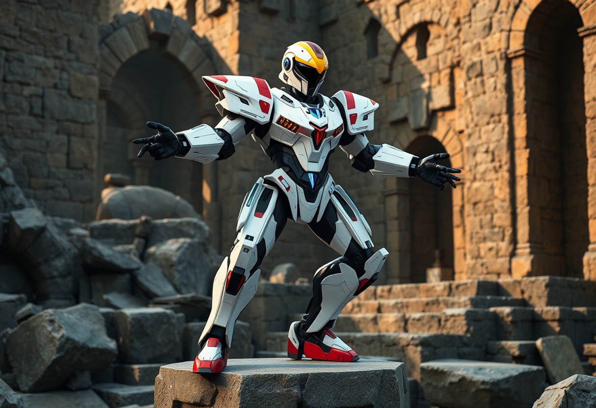 A Cyber Soldier of Darkworld robot, stark white armor with crimson & sapphire accents, black limbs, vibrant yellow head, ruby visor, geometric blue/white chest, scarlet feet. Heroic stance, arms posed for action, balanced posture on an ancient stone plinth. Amidst the mystic ruins of TheSecret Village of the Spellcasters. Poised stillness charged with latent energy. Cinematic lighting, Octane Render, Unreal Engine 5, Photorealistic, trending on ArtstationHQ, CGSociety, 4K, HDR, Sharp focus, Dynamic Angle, Golden Ratio, Matte Painting, Splash Ink style. Detailed, high quality, intricate.