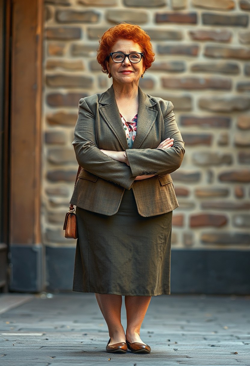 full body shot masterpiece portrait of a plump mature woman::1.4, Norman Rockwell style::1.2, realistic impressionist art::1.1, (physical description: full body shot, plump build, mature age, red curly hair, wearing glasses, arms crossed:1.1) (facial features, expression: soft and confident expression, gentle smile lines, thoughtful gaze through round glasses:1.0) (clothing details: tailored jacket paired with a knee-length skirt, round toe flats in a coordinating color:1.0) (accessories: simple earrings or minimal jewelry, subtle handbag or no bag:0.9) (background setting: urban sidewalk or small town square, textured stone or brick background:0.9) (lighting style: natural soft daylight with warm highlights:0.8) (composition and camera framing: full body centered portrait, eye-level angle, candid posture with arms crossed:1.0) (emotional tone or theme: self-assured, comfortable elegance, quietly bold presence:0.9) (technical execution: clean sharp details, rich color tones with natural shadows, painterly realism:0.8)