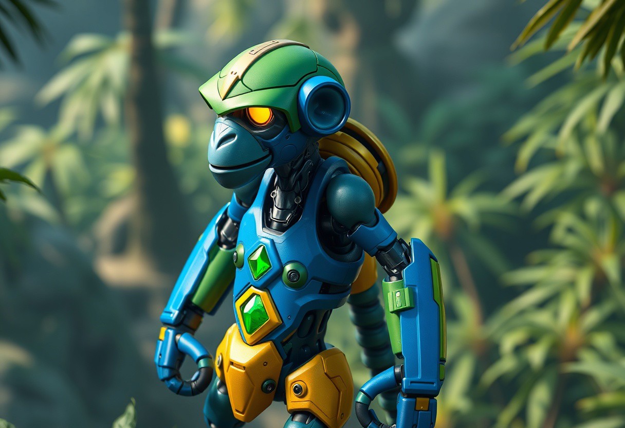 epic details Vibrant blue Acrobat Monkey robot with green helmet, yellow visor gleam, green limbs, yellow chest plate, green gem sparkle, stands proudly on a jungle dweller. Poised for action, head turned left. Lush jungle setting. Isometric view, dynamic pose, cinematic lighting, depth of field. Concept art, Octane Render, Unreal Engine, trending on Artstation, Golden Ratio composition, intricate detail.