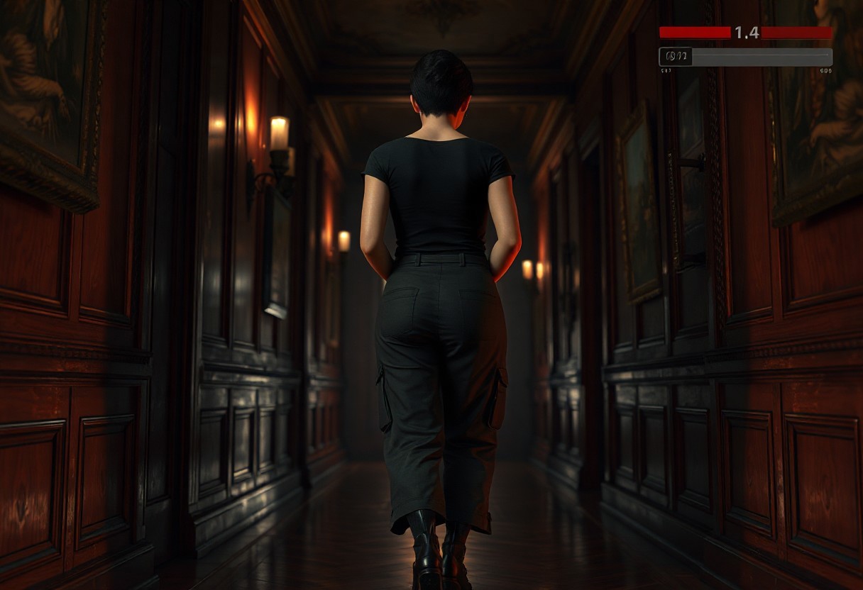 masterpiece portrait of woman walking down a mansion hallway::1.4, video game concept art style::1.2, semi-realistic 3D render art::1.1, (physical description: pudgy build, not skinny or obese, sturdy posture, mature proportions, hands clasped behind back:1.1), (facial features, expression: not visible, back-facing view:1.0), (clothing details: dark fitted top, long skirt or tactical cargo pants, utilitarian footwear:1.0), (accessories: none visible from rear view:0.9), (background setting: richly decorated dimly lit hallway in a vintage mansion, with wooden wall panels, sconces, and antique paintings:0.9), (lighting style: moody cinematic lighting with warm shadows and directional highlights from wall sconces:0.8), (composition and camera framing: third-person video game view from slightly behind and above, full body shot, centered in frame:1.0), (emotional tone or theme: immersive, suspenseful, exploratory atmosphere:0.9), (technical execution: includes a video game-style HUD with red health bar in the top right corner and a minimap with icons in the lower left:0.8)