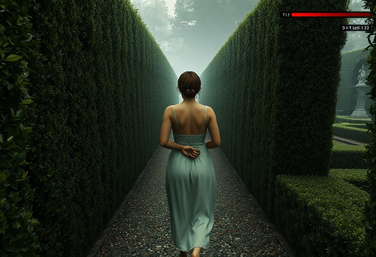 masterpiece portrait of woman walking through a hedge maze::1.4, video game concept art style::1.2, semi-realistic 3D render art::1.1, (physical description: pudgy build, not skinny or obese, sturdy posture, mature proportions, hands clasped behind back:1.1), (facial features, expression: not visible, back-facing view:1.0), (clothing details: , nightgown barefoto:1.0), (accessories: none visible from rear view:0.9), (background setting: dense, tall hedge maze with narrow gravel paths and trimmed walls of greenery, ambient mist and distant garden statues:0.9), (lighting style: overcast natural daylight with diffused shadows and a muted, mysterious ambiance:0.8), (composition and camera framing: third-person video game view from slightly behind and above, full body shot, centered in frame:1.0), (emotional tone or theme: immersive, exploratory, quiet suspense:0.9), (technical execution: includes a video game-style HUD with red health bar in the top right corner and a minimap with icons in the lower left:0.8)