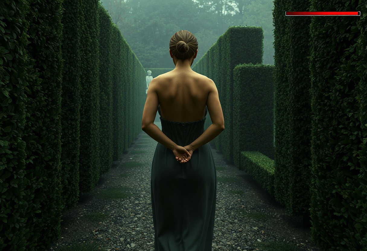 masterpiece portrait of woman walking through a hedge maze::1.4, video game concept art style::1.2, semi-realistic 3D render art::1.1, (physical description: pudgy build, not skinny or obese, sturdy posture, mature proportions, hands clasped behind back:1.1), (facial features, expression: not visible, back-facing view:1.0), (clothing details: , nightgown barefoto:1.0), (accessories: none visible from rear view:0.9), (background setting: dense, tall hedge maze with narrow gravel paths and trimmed walls of greenery, ambient mist and distant garden statues:0.9), (lighting style: overcast natural daylight with diffused shadows and a muted, mysterious ambiance:0.8), (composition and camera framing: third-person video game view from slightly behind and above, full body shot, centered in frame:1.0), (emotional tone or theme: immersive, exploratory, quiet suspense:0.9), (technical execution: includes a video game-style HUD with red health bar in the top right corner and a minimap with icons in the lower left:0.8)