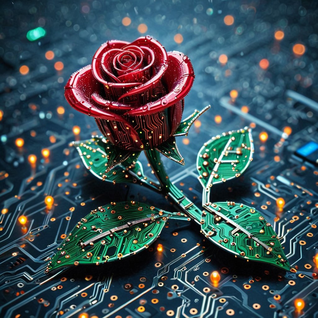 ,pcb_style, best artist, best shadows, best lighting, best textures, masterpiece, Rose made of circuit board, glowing lights, cyberpunk, dewdrops, bokeh,