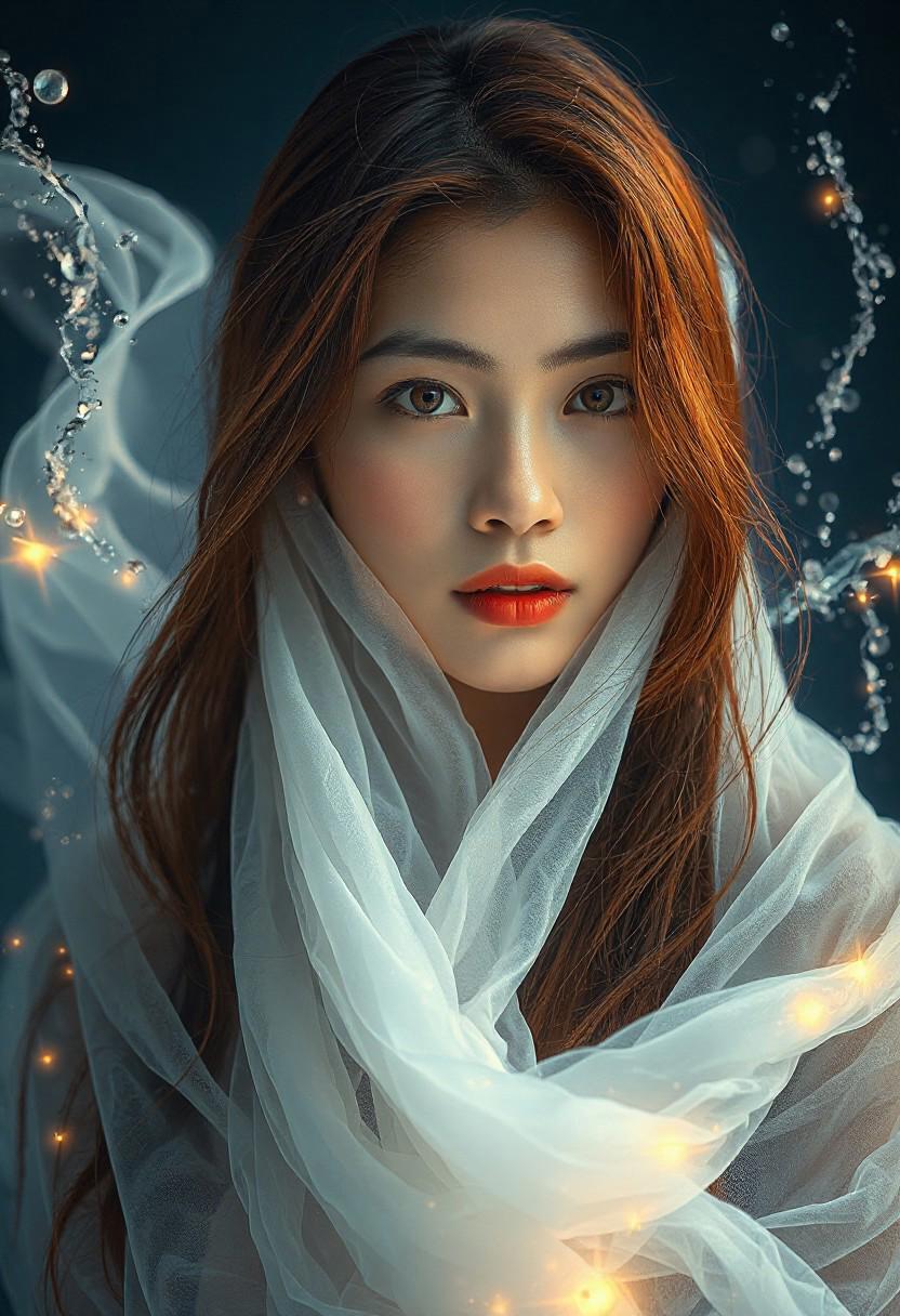 Close-up photo of a captivating, luminous Indonesian woman with long, flowing auburn hair, fair features, and a serene gaze, is depicted in a digital photo art style. She is draped in translucent, gossamer white fabric that swirls around her as if in a gentle current, creating an ethereal and fluid grace. Surrounding her, dynamic and glowing patterns of light and water, along with shimmering droplets and ethereal mist, create a sense of magical flux and otherworldly aura. The background is a soft, deep dark blue, hinting at a mystical realm or a liquid dreamscape, with sparkling tendrils and glowing water droplets creating a cosmic effect. The overall impression is a beautiful spirit manifesting from a realm of pure light and liquid, combining the delicate beauty of the model with fantastical element