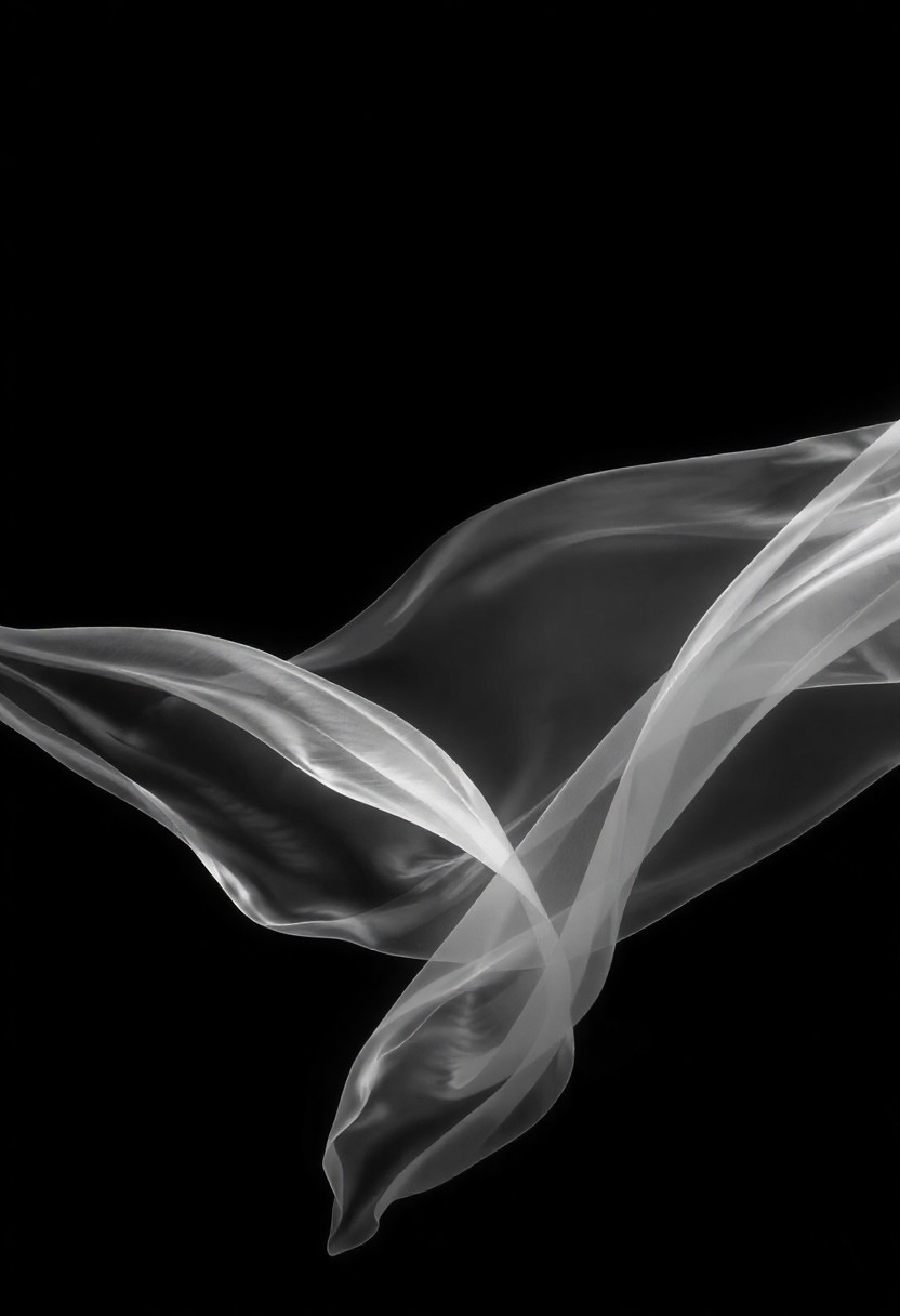 An abstract composition of wind depicted as flowing translucent ribbons slicing through a dark void, stylized in high-contrast black and white with subtle glowing edges. The scene is minimal, with sparse lines and gentle gradients that evoke ethereality, sharp directional lighting creating deep shadows and narrow highlights, cinematic surreal mood, vivid style