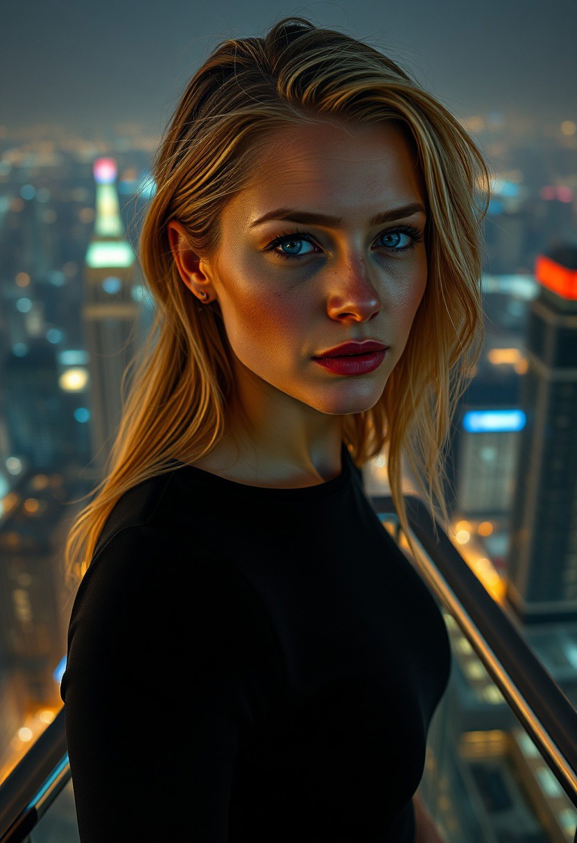 On a high-floating modern terrace above a glowing city skyline, a golden-haired woman stands motionless, her facial features captured with clinical hyperrealism. Every aspect of her skin, from tiny wrinkles to freckles and glistening highlights, is shown in extreme focus. Her golden hair, styled simply, glints with ambient reflections from the night city lights. She wears a sleek, form-fitting black dress with a matte texture, contrasting her luminous skin. Behind her, the railing of the terrace is minimalist chrome, and the blurred glow of urban architecture gives a dreamlike backdrop. The atmosphere is cinematic yet grounded, blending intimate realism with the surreal grandeur of the setting. Her expression is neutral, contemplative, radiating presence and depth.