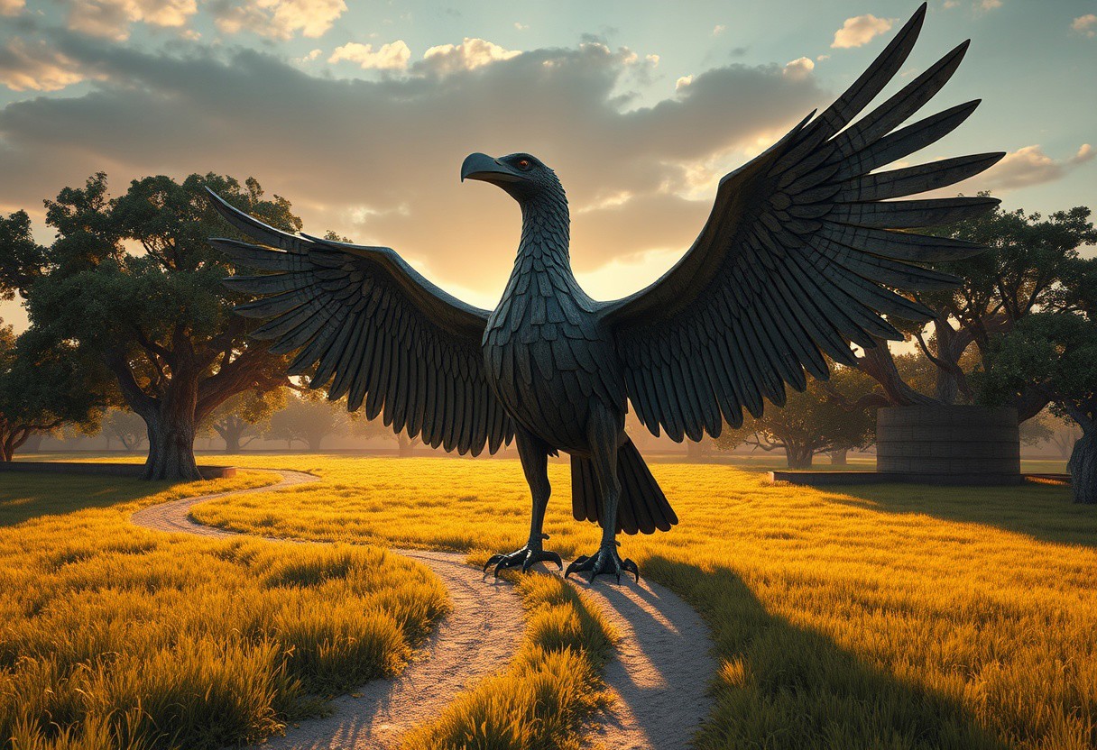 epic details A colossal, imposing bird sculpture, crafted from weathered metal & aged wood, wings dramatically spread, head turned left, poised in a vast grassy field. Surrounded by a winding dirt path, ancient trees form a natural backdrop. Cinematic golden hour lighting, volumetric rays, rich harmonious palette. Ultra-detailed, intricate textures, sharp focus. Matte painting quality. Masterpiece composition, creative angle, Golden Ratio. Octane Render, Unreal Engine 5, Houdini Style, CGSociety, trending on Artstation.