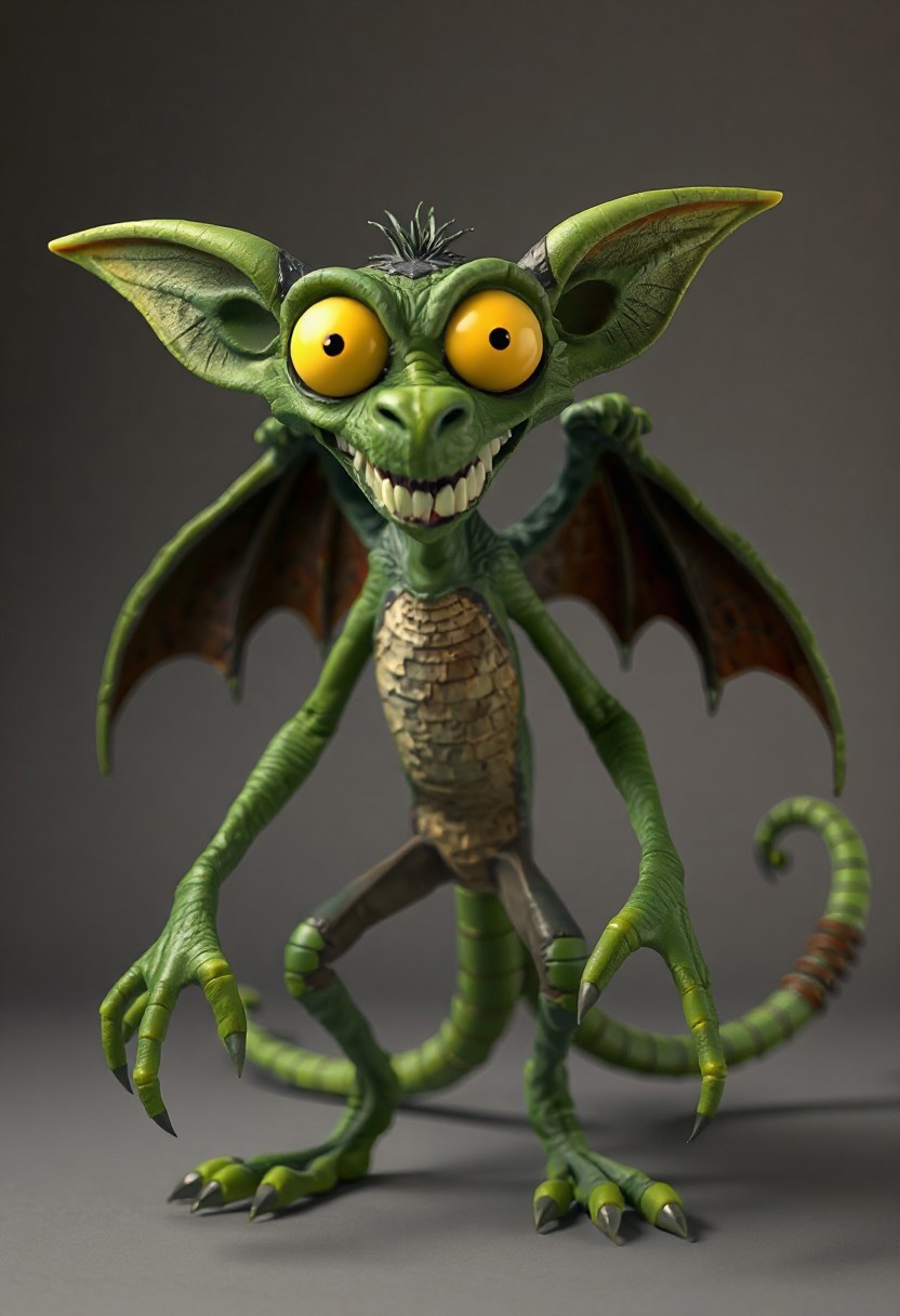 Clay Animation - a pixar style 3d animated green character called a jabberwock, angry, fierce, scary, big yellow eyes, wings, scales. long ears. long sharp teeth. at least ten feet tall with a simian like build, almost like a lemur. dancing, Its limbs are long and elongated and slender, 3 long fingers and claws. with a pointed end long tail ending, standing on two toes with a dewclaw/thumb. looking at camera over a simple background