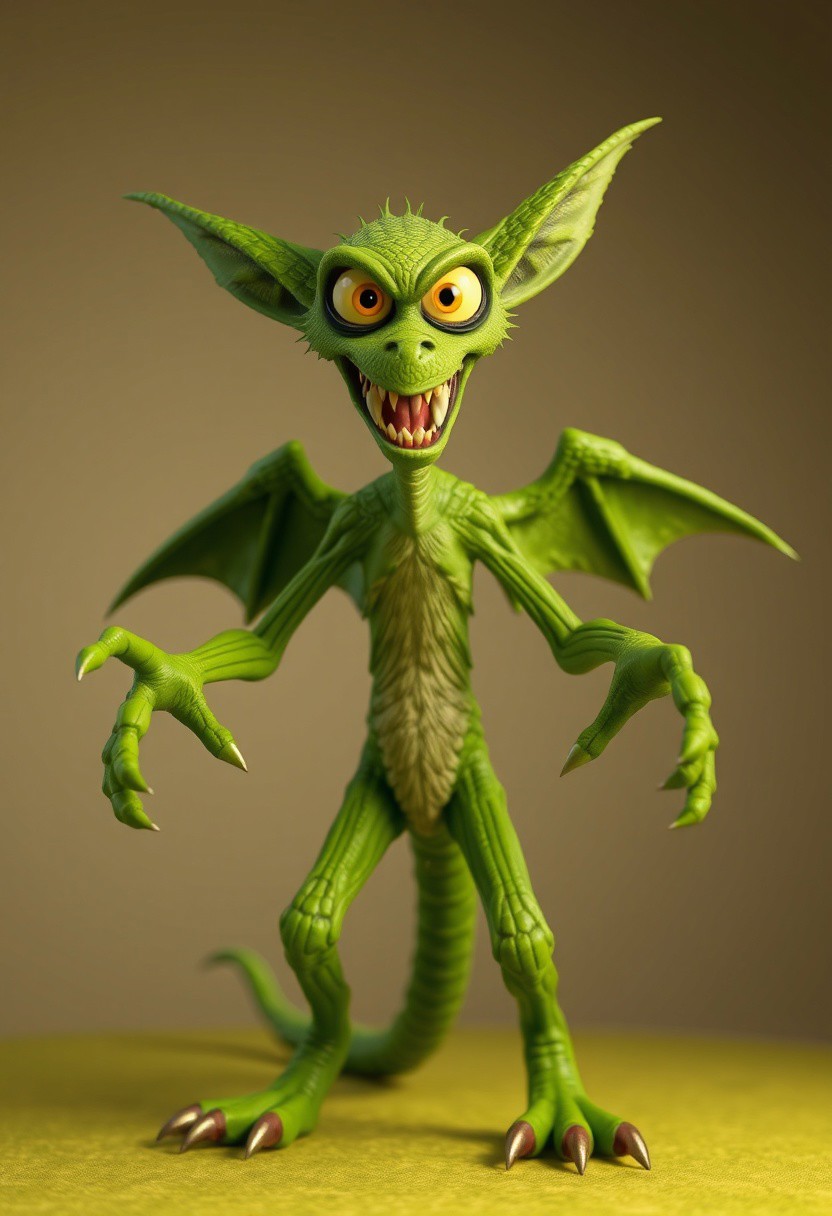 Clay Animation - a pixar style 3d animated green character called a jabberwock, angry, fierce, scary, big yellow eyes, wings, scales. long ears. long sharp teeth. at least ten feet tall with a simian like build, almost like a lemur. dancing, Its limbs are long and elongated and slender, 3 long fingers and claws. with a pointed end long tail ending, standing on two toes with a dewclaw/thumb. looking at camera over a simple background