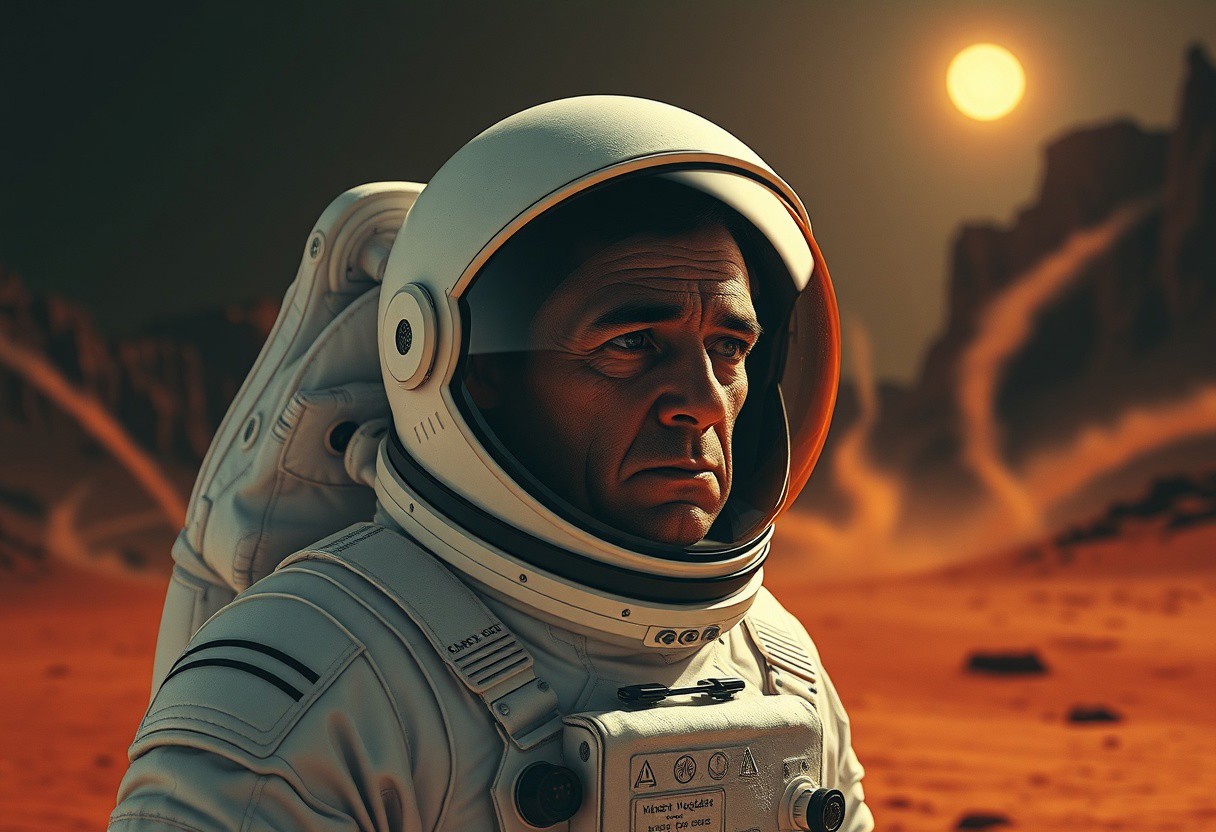 very dark photo, hyper detailed, astronaut, astronaut in a white space suit. The astronaut is wearing a helmet with a clear visor, the helmet is round in shape. the astronaut has a sad expression. The astronaut is standing on a martian landscape, red desert, high cliffs in the background, dust devils cross the sands and break against the cliffs. The sun is small in the sky and a pale yellow. (real skin, textured skin, intricately detailed eyes:1.3), (high saturation:1.2), (high contrast:1.1), (subsurface scattering:0.9), (depth of field:1.2), (by Larry Elmore:1.5), <lora:nipples:-0.99>