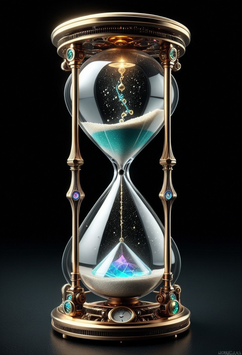 best quality, masterpiece, high resolution, intricate detailed, cs-cr1stal-v2, (hourglass:1.1) g3ars, steampunk, whimsical, hourglass made of single huge brilliant, translucent, iridescent, ethereal, majestic, detailed digital art, close up, ground shot, dark background, black background,
