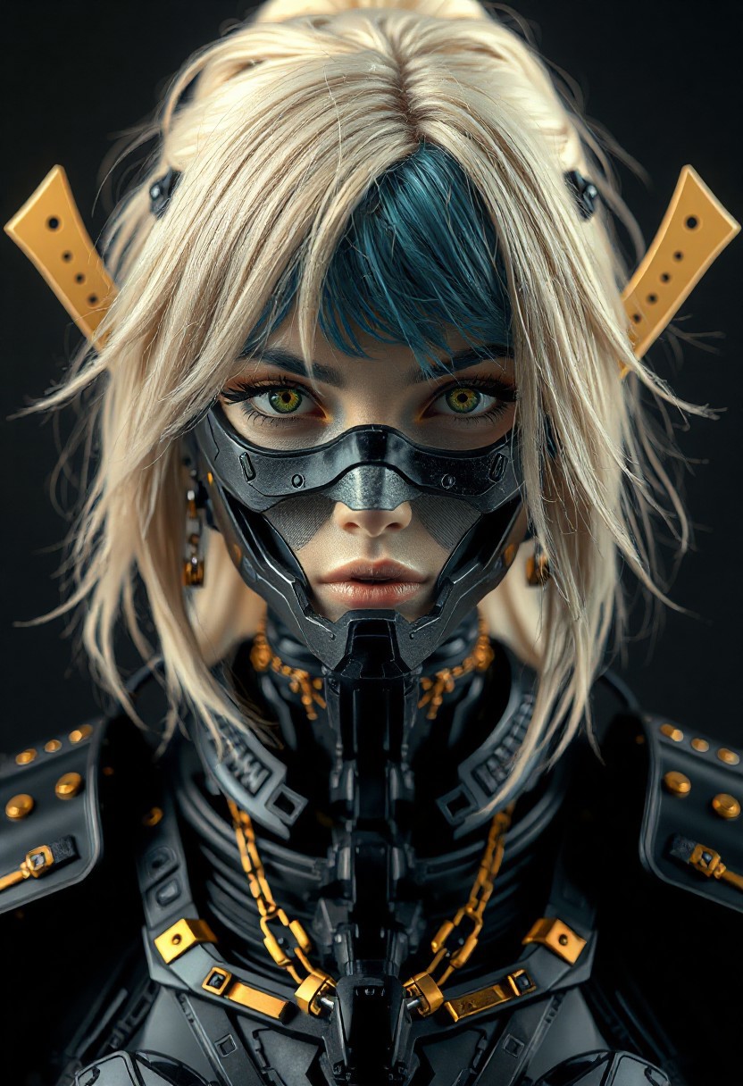 Front View Portrait of a female blonde Humanoid with a futuristic black and gold samurai armor, robotic humanoid face, advanced technology, blue hair, her neck is covered with a matte black steel robotic device, golden jewelries, Centered Composition, cyberpunk, hip-hop aesthetics, intricate details, realistic shadows and details, ultra sharp, sharpness, extremely detailed, superb quality, 8K, Vibrant colors, saturated colors, high contrast, studio lighting,