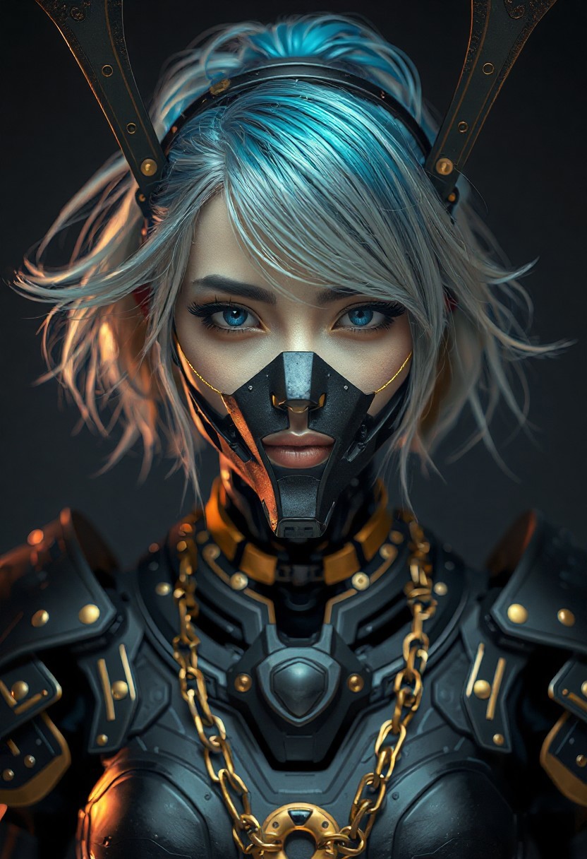 Front View Portrait of a female blonde Humanoid with a futuristic black and gold samurai armor, robotic humanoid face, advanced technology, blue hair, her neck is covered with a matte black steel robotic device, golden jewelries, Centered Composition, cyberpunk, hip-hop aesthetics, intricate details, realistic shadows and details, ultra sharp, sharpness, extremely detailed, superb quality, 8K, Vibrant colors, saturated colors, high contrast, studio lighting,