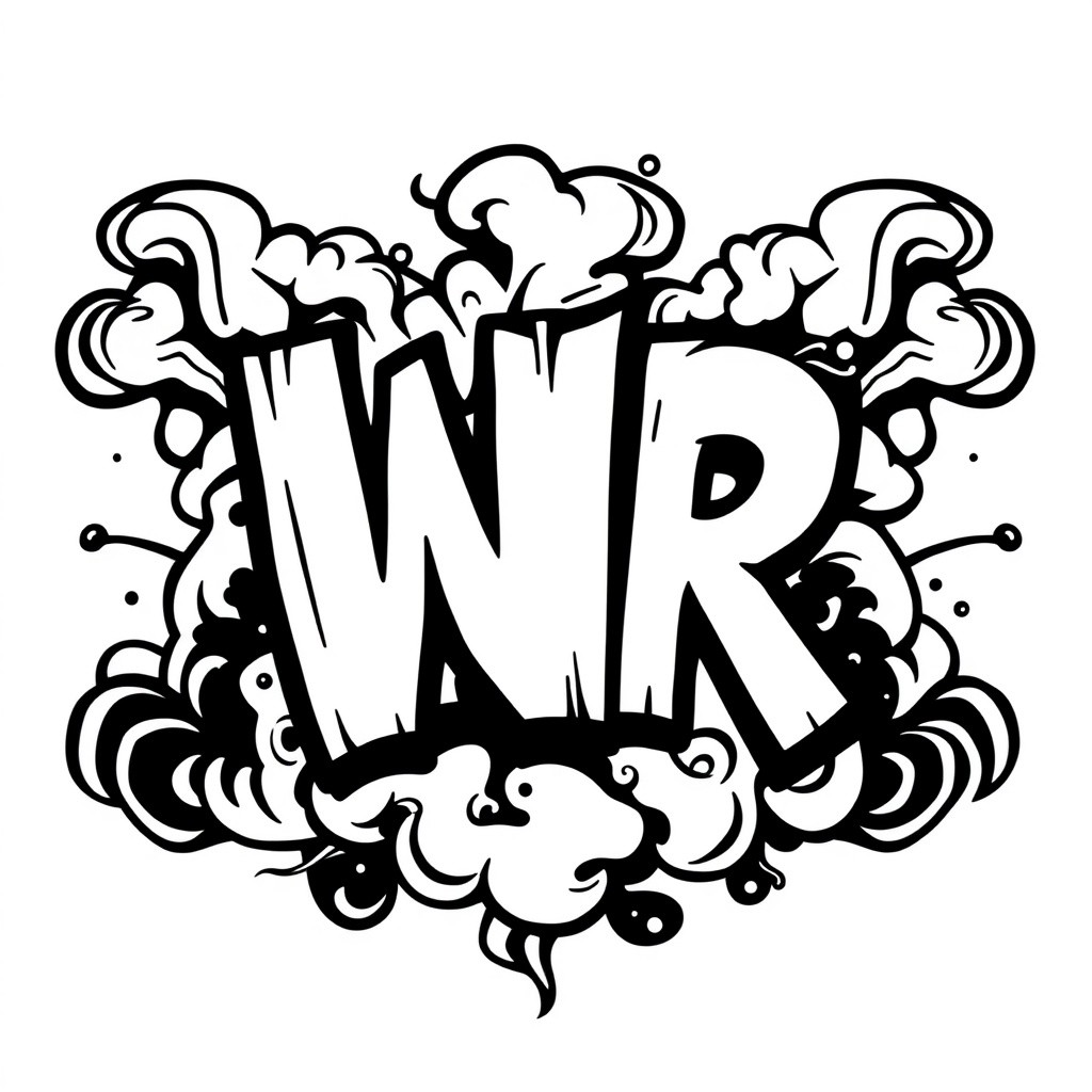 A bold, stylized graffiti-style vector logo featuring the large capital letters “WR” in a dynamic, hand-drawn cartoon font. The letters are filled with clean white, framed by thick black outlines with jagged, expressive brushwork.A high-contrast vector logo design for a vape brand, featuring the bold capital letters “WR” in a graffiti-inspired cartoon font. The letters are large, rounded, and white with thick, black comic-style outlines and soft irregular edges. Behind and around the text, massive stylized clouds of vapor billow outward in dramatic shapes — swirling, curling, and overlapping like exhaled vape plumes. The smoke clouds are not static: they express movement and density, evoking the act of vaping in mid-exhale. Hidden among the vapor shapes are subtle icons: droplets of e-liquid, a sleek vape pod silhouette, and fluid streamlines suggesting airflow. The composition is symmetric and centralized, optimized for packaging or sticker use. Designed for Civitai LoRA testing and generation. Style → Flat vector illustration, graffiti-meets-vape aesthetic, clean comic contours, black-and-white vapor stylization, dynamic motion. No gradients or textures. Emphasis on bold lettering and energetic vapor forms. Ideal for LoRA style training and label generation within civitai.com using flux1-dev-compatible models.