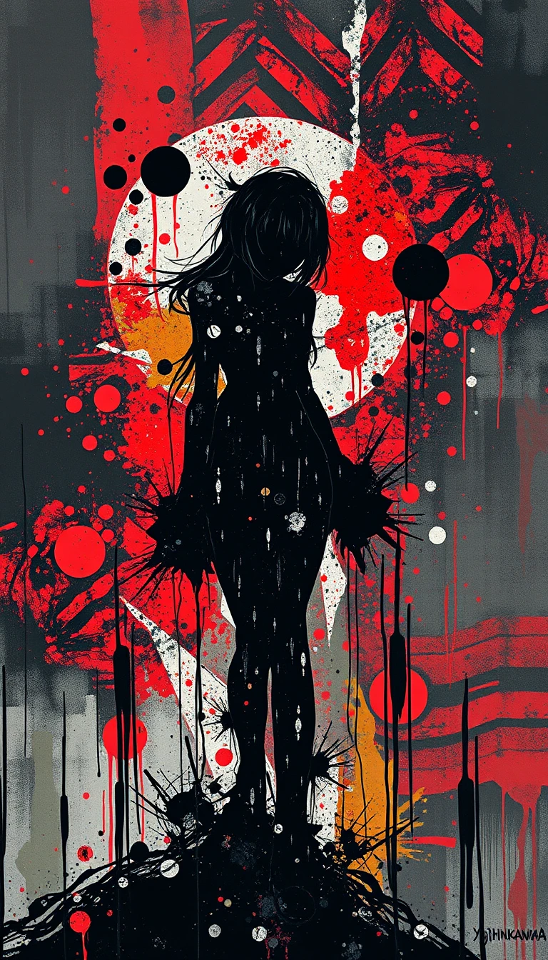 dead stranding art,by Yoji Shinkawa, futuristic context backgrounds, dark colors, (dutch angle:0.2), neo abstract, explosive brush strokes, vibrant color splashes, gestural marks, emotional intensity, chaotic energy, style raw, silhouette woman, Fragile