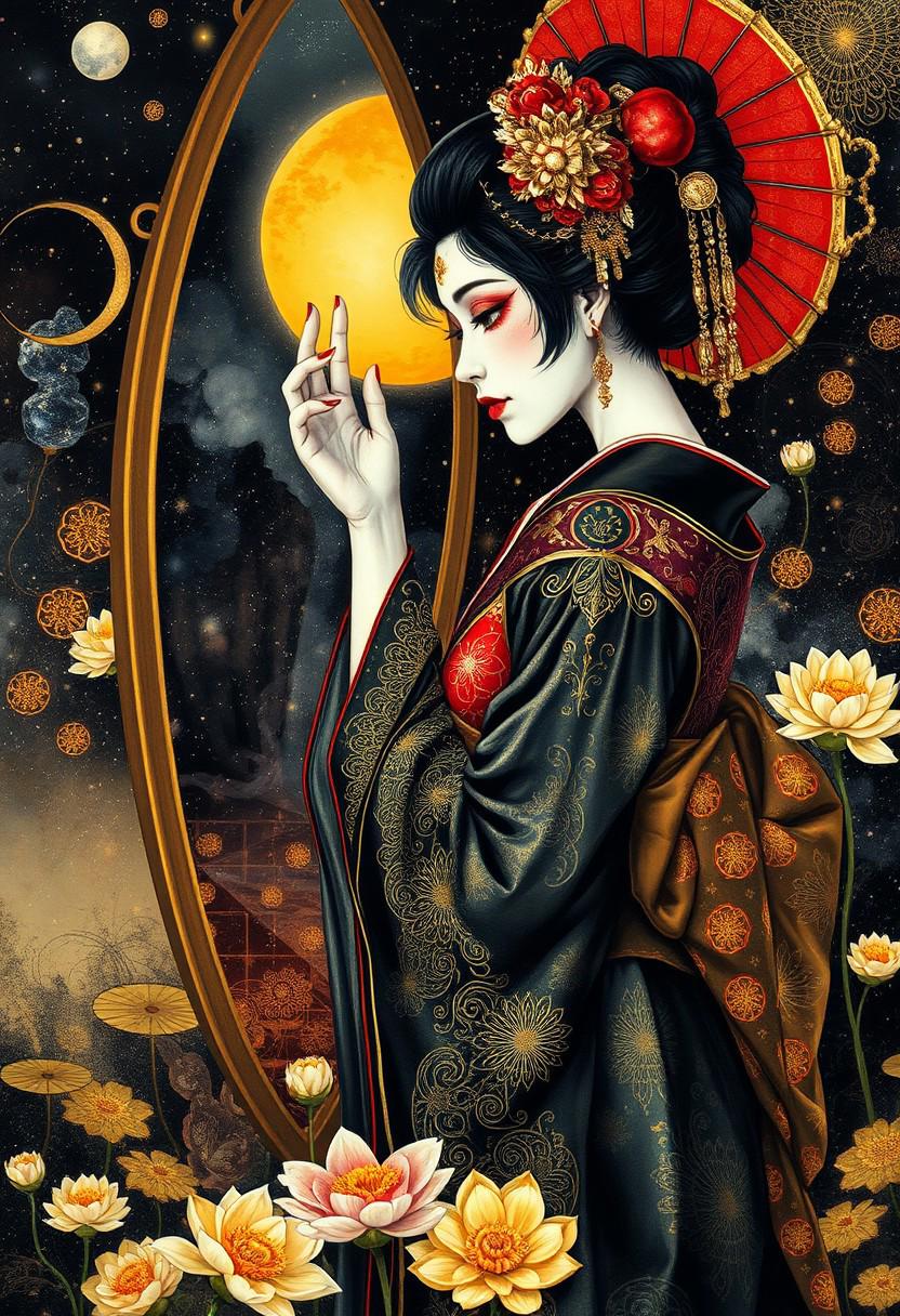 artistic style art, drawing panel Beautiful Geisha in black and white and red yellow golden dress touching a mirrored reflection of herself, intricate golden motifs, chrysanthemum and lilly and lotus pond, glowing outer space background, dark hair, dark fantasy, intricate details, hyper detailed, Jean Baptiste Monge, Carne Griffiths, Michael Garmash, seb McKinnon, masterpieceugly, tiling,