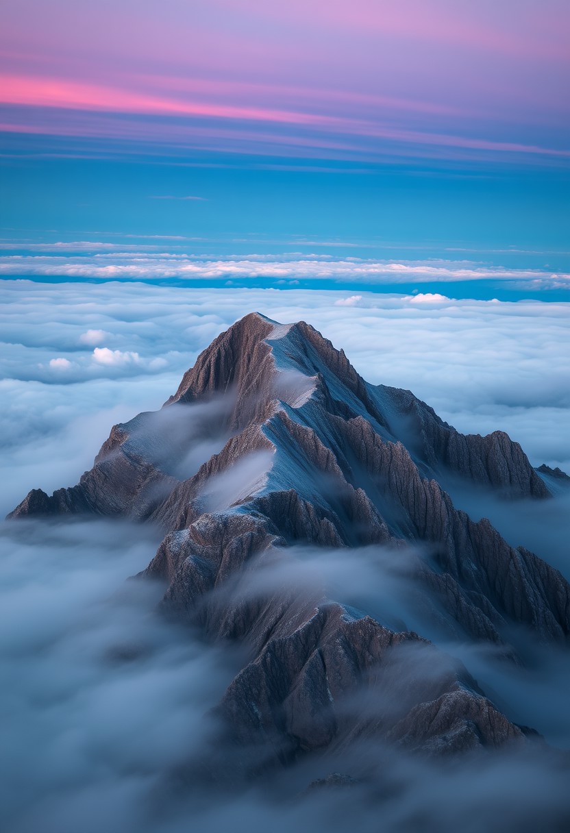 A mountain peak emerging through layers of thinning mist, its surface marked by smooth, flowing rock formations that align into a calm, knowing expression only visible at twilight, distant clouds catching warm pink and blue hues, a serene blend of natural whimsy and minimal sculptural form, vivid