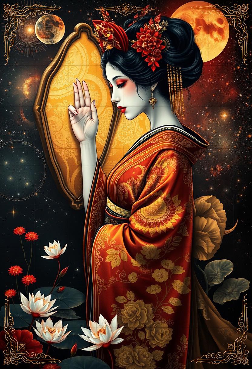 artistic style art, drawing panel Beautiful Geisha in black and white and red yellow golden dress touching a mirrored reflection of herself, intricate golden motifs, chrysanthemum and lilly and lotus pond, glowing outer space background, dark hair, dark fantasy, intricate details, hyper detailed, Jean Baptiste Monge, Carne Griffiths, Michael Garmash, seb McKinnon, masterpieceugly, tiling,